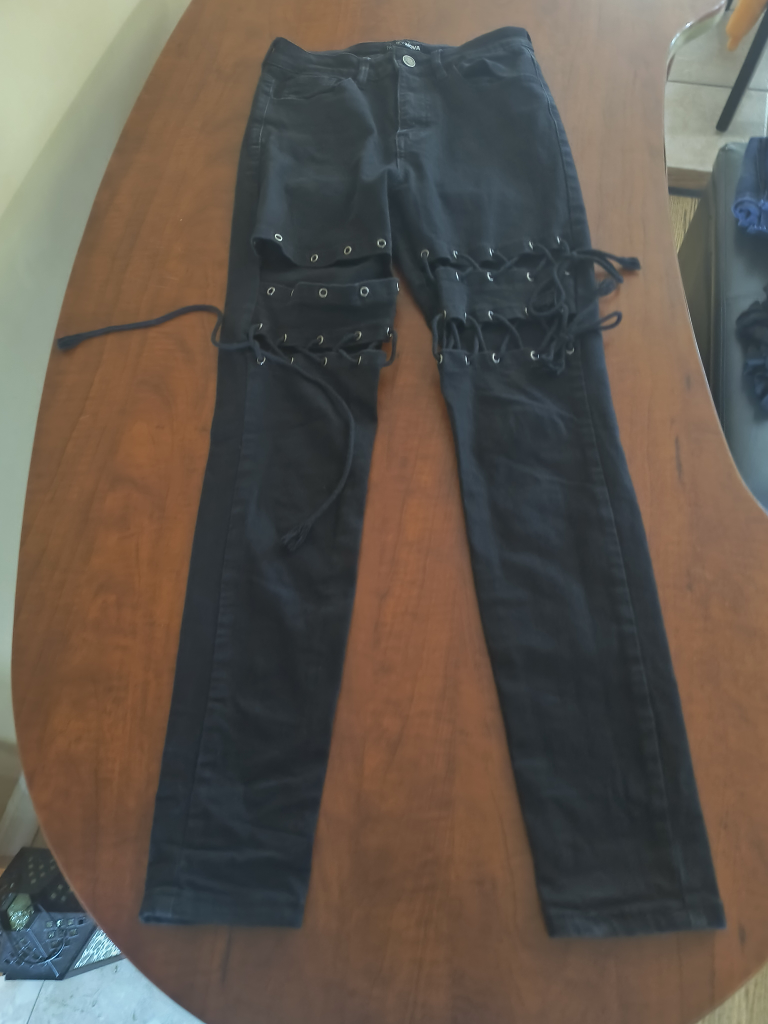 Selling a pair of Fashion Nova black jeans in size 3. They have a unique design with laced detailing on the legs. The material is a blend of rayon/elastane, making them comfortable and stretchy. Perfect for adding a bit of edge to your outfit! one lace got lost, but can easily be replaced by Hoodie strings.