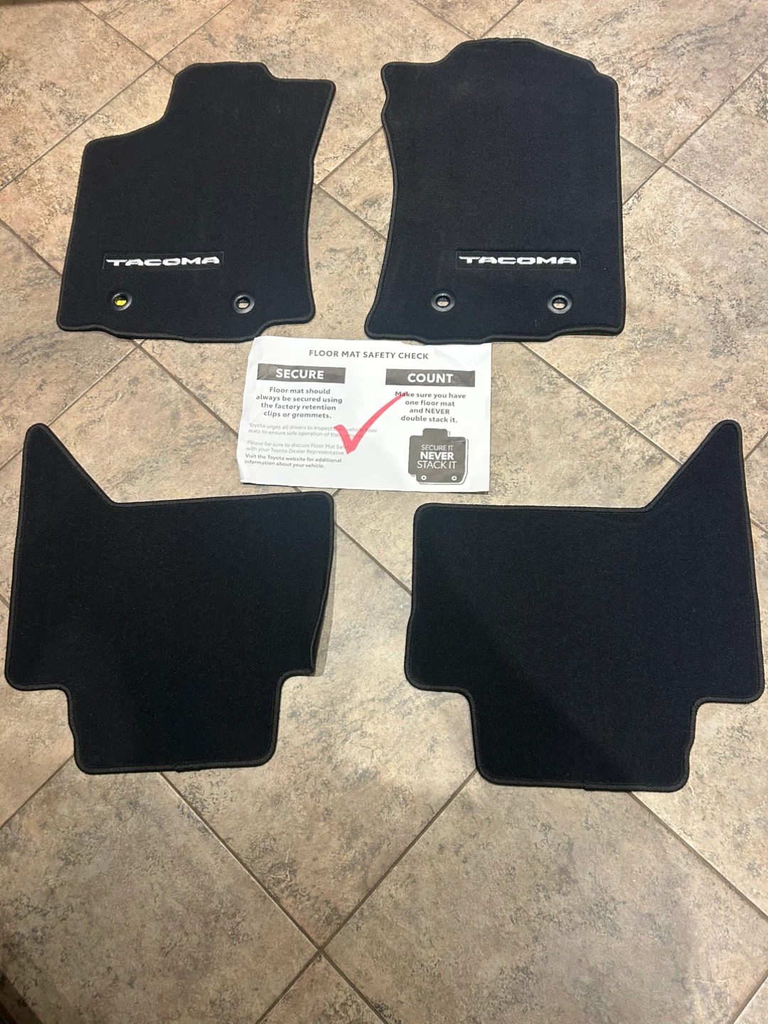 Set of four black all-weather floor mats for a Toyota Tacoma. These mats are designed to protect your vehicle's carpet from dirt and moisture. They feature the 'Tacoma' logo on the front mats. Brand new never used
