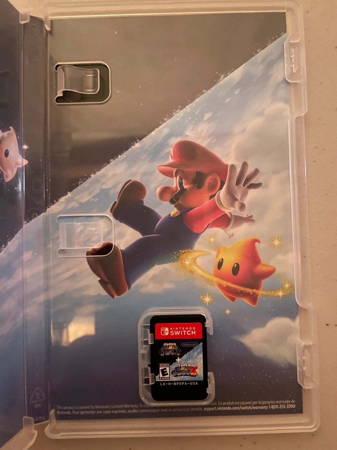 This is the Super Mario Galaxy and Super Mario Galaxy 2 game for the Nintendo Switch. It includes the game cartridge and the original case. The game is rated E for Everyone.