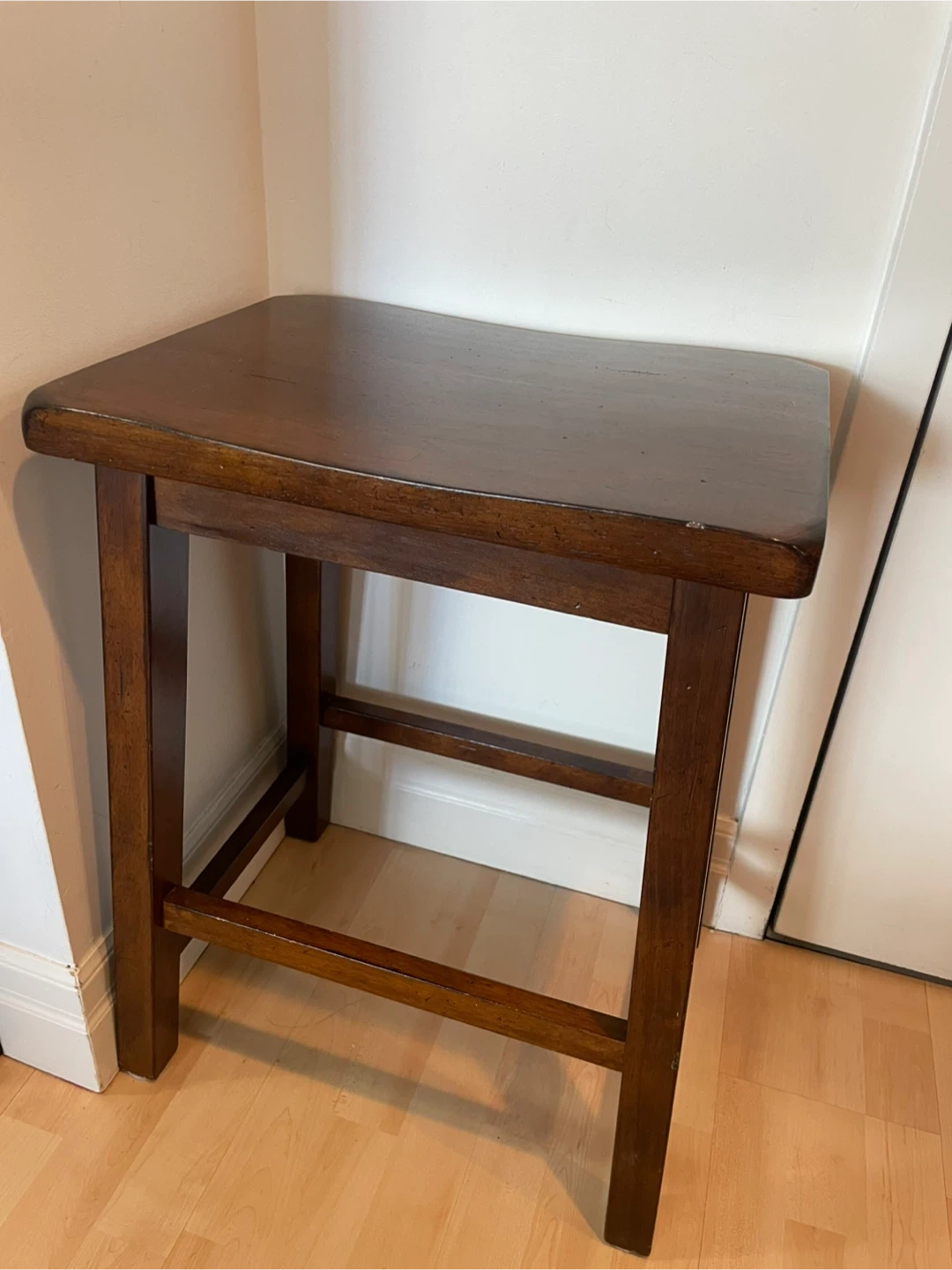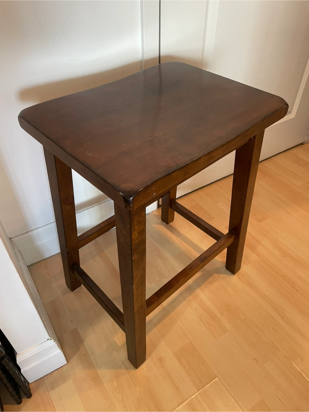 Sturdy wooden stool, with rounded corners to the seat. I used it as an entryway table in a small space- very handy!