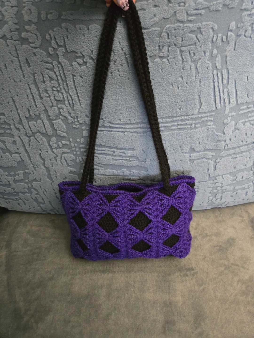 handmade crochet purse in a beautiful purple and black colour. Has a diamond pattern throughout. The braided straps are sturdy, comfortable and allow the purse to be worn as a crossbody/shoulder purse or a handbag