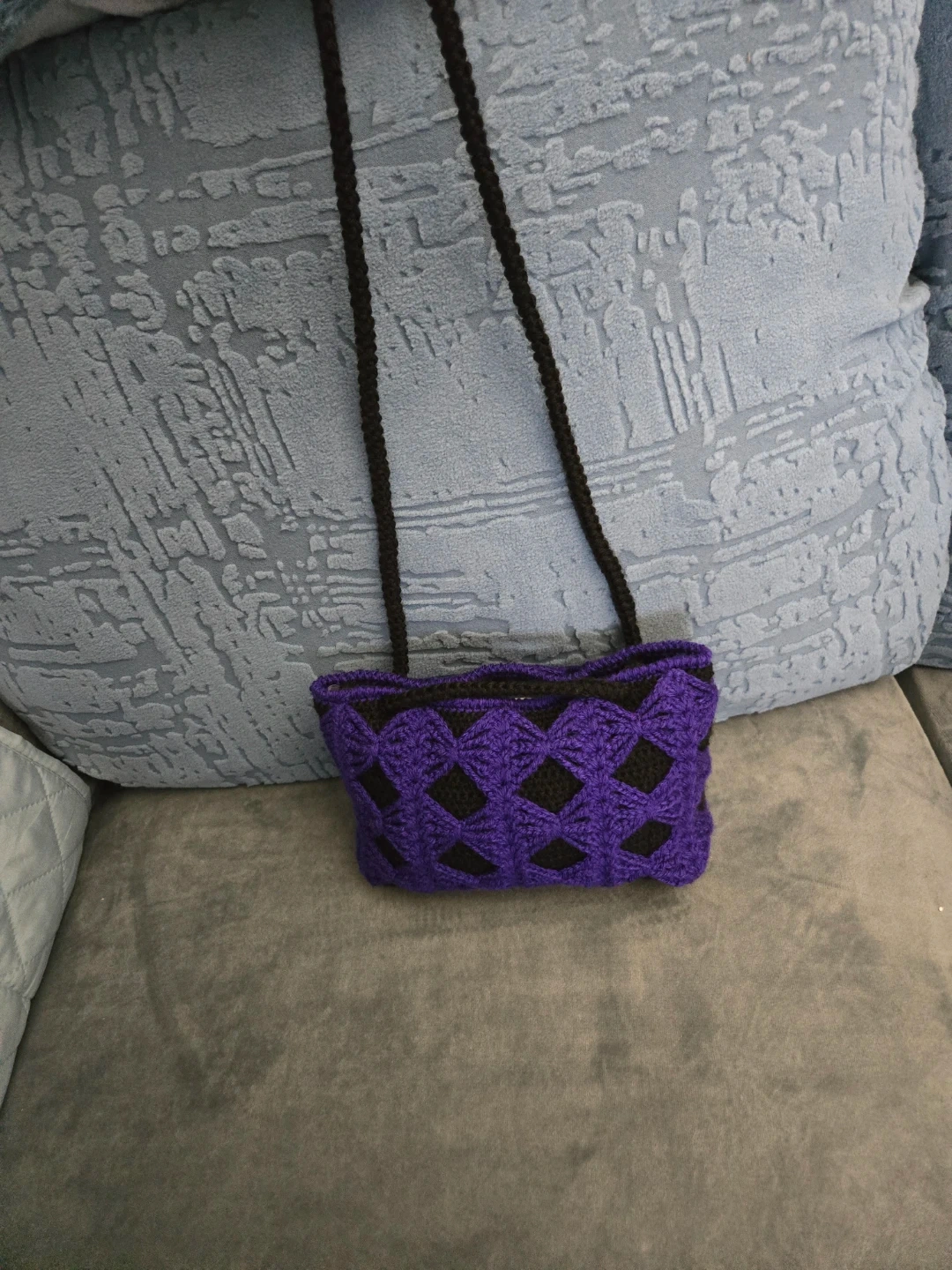 handmade crochet purse in a beautiful purple and black colour. Has a diamond pattern throughout. The braided straps are sturdy, comfortable and allow the purse to be worn as a crossbody/shoulder purse or a handbag