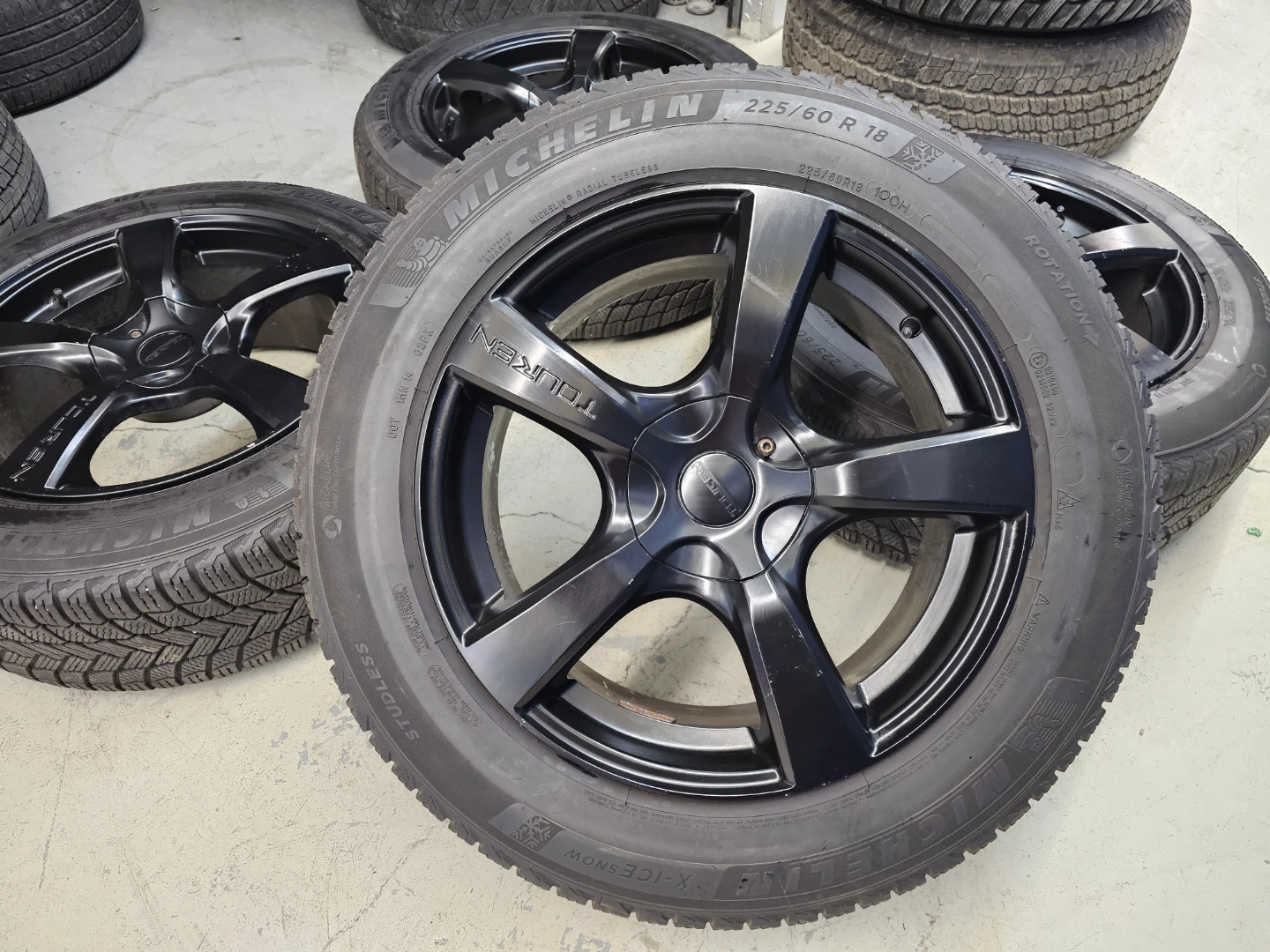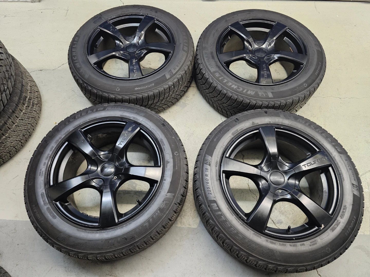Set of 4 18" Michellin X-ICE winter tires on touren rims 225/60/R18. Rims and tires are in good shape, no bend, no cracks, no damage. Lots of thread left on tires, no patch, no leaks. Rims are multi-fit with bolt pattern 5×120 and 5×112