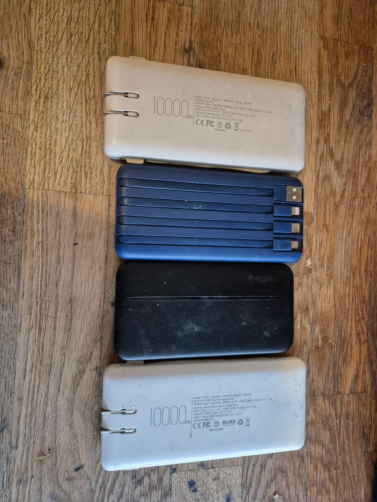 Selling a set of four portable power banks, each with a capacity of 10000mAh. There's a mix of brands including Charmast and Veegr. They're great for keeping your devices charged on the go! all 4 for 12 .00 or 2 for 7.00