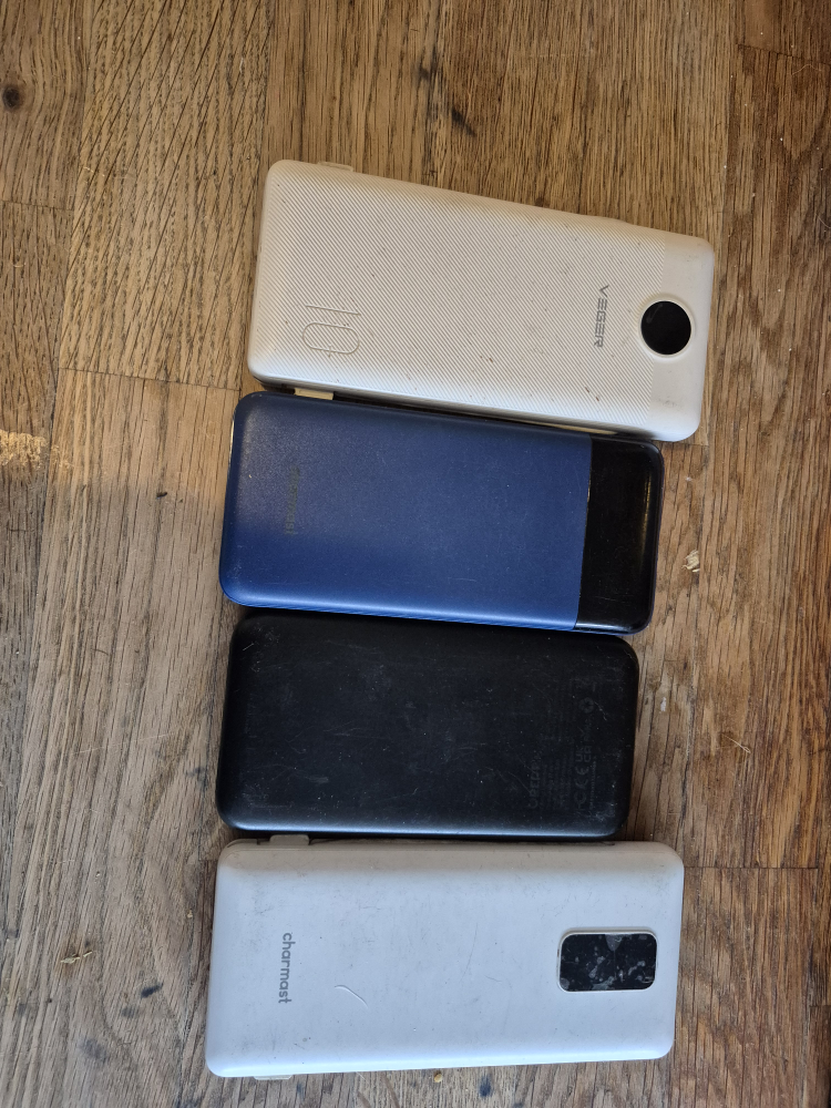 Selling a set of four portable power banks, each with a capacity of 10000mAh. There's a mix of brands including Charmast and Veegr. They're great for keeping your devices charged on the go! all 4 for 12 .00 or 2 for 7.00