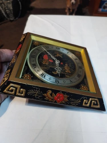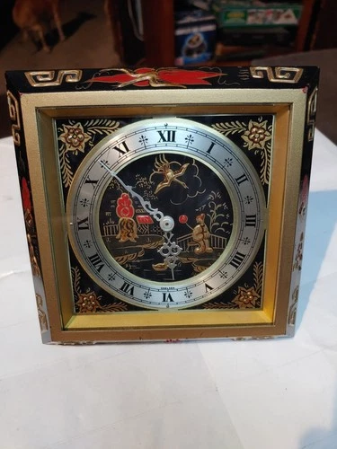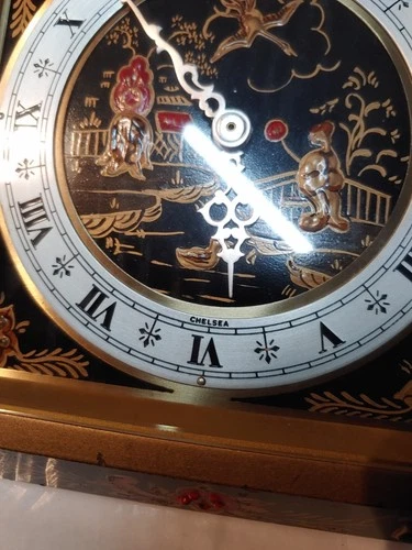 Chelsea Hand Painted Asian Enamel Desk Clock ..HOLDS TIME PERFECTLY... has cosmetic wear otherwise works perfectly