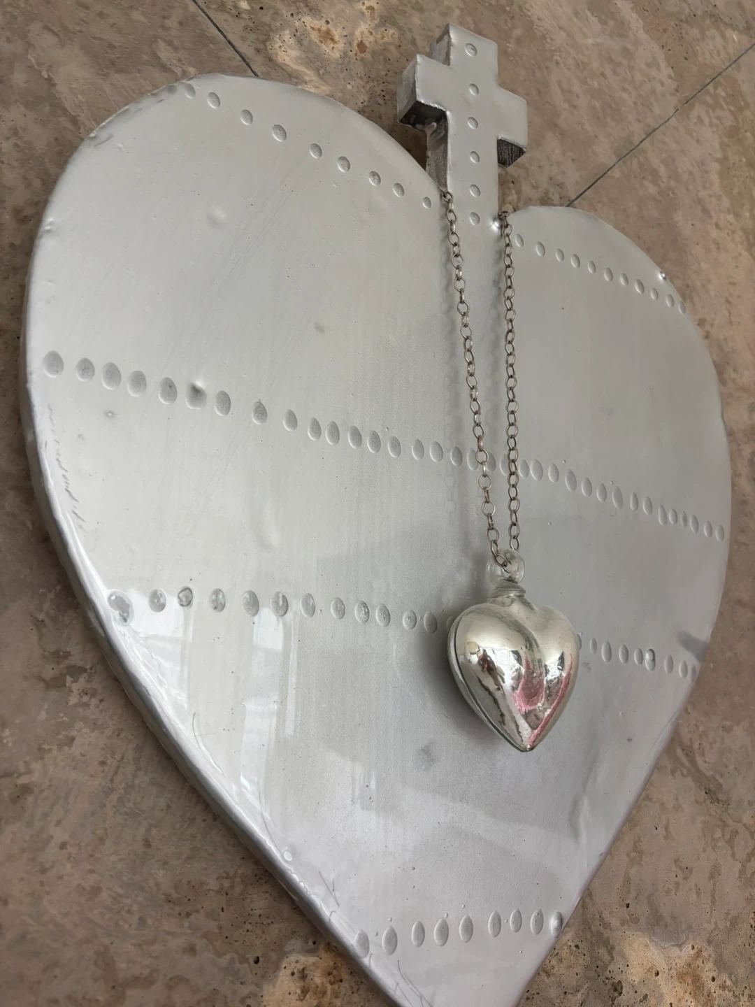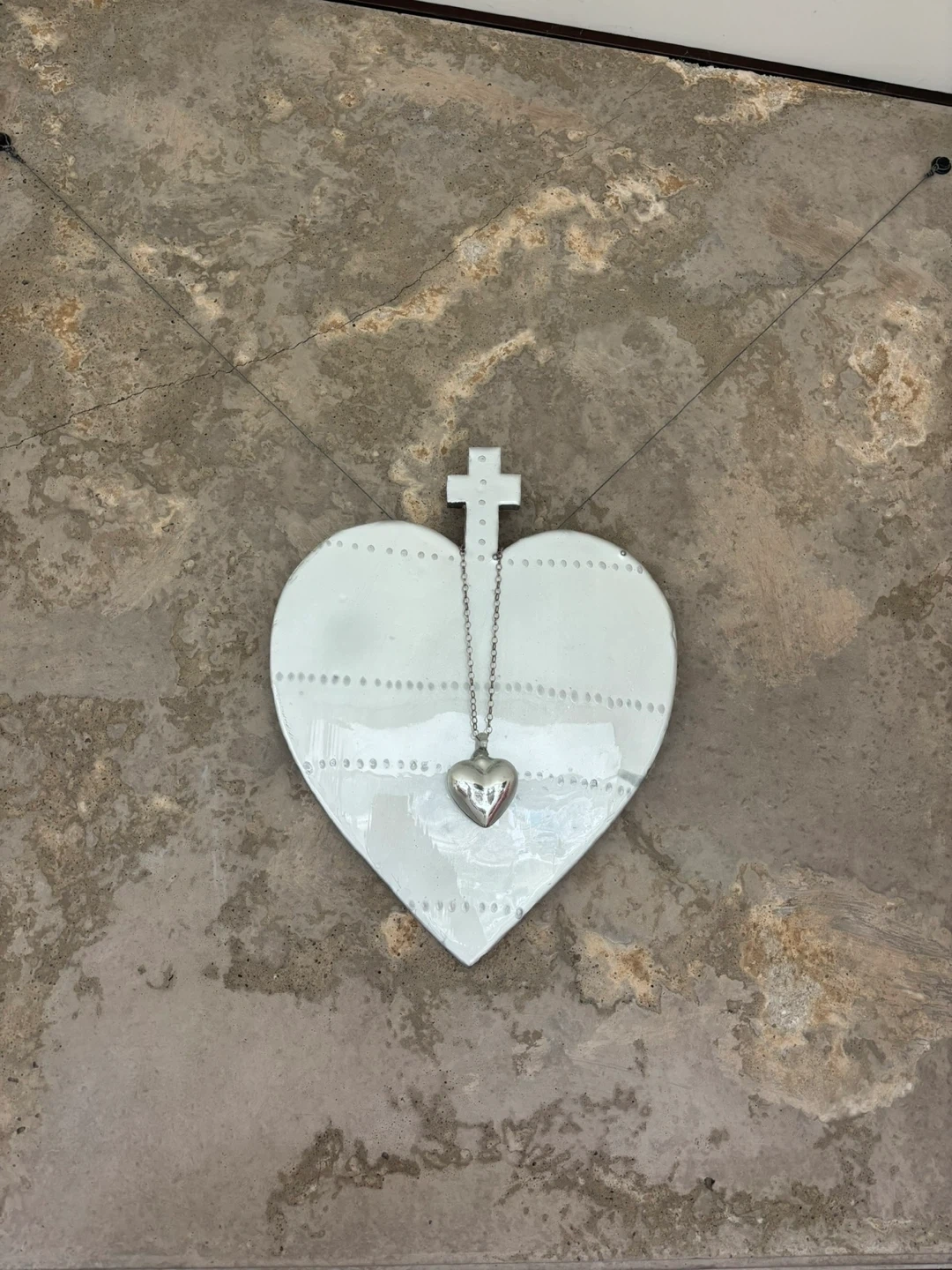 This decorative white heart wall plaque features a small, shiny silver heart charm hanging from a delicate chain. It has a cross detail at the top. The plaque's surface has a textured, riveted design. It's a lovely piece for home decor.