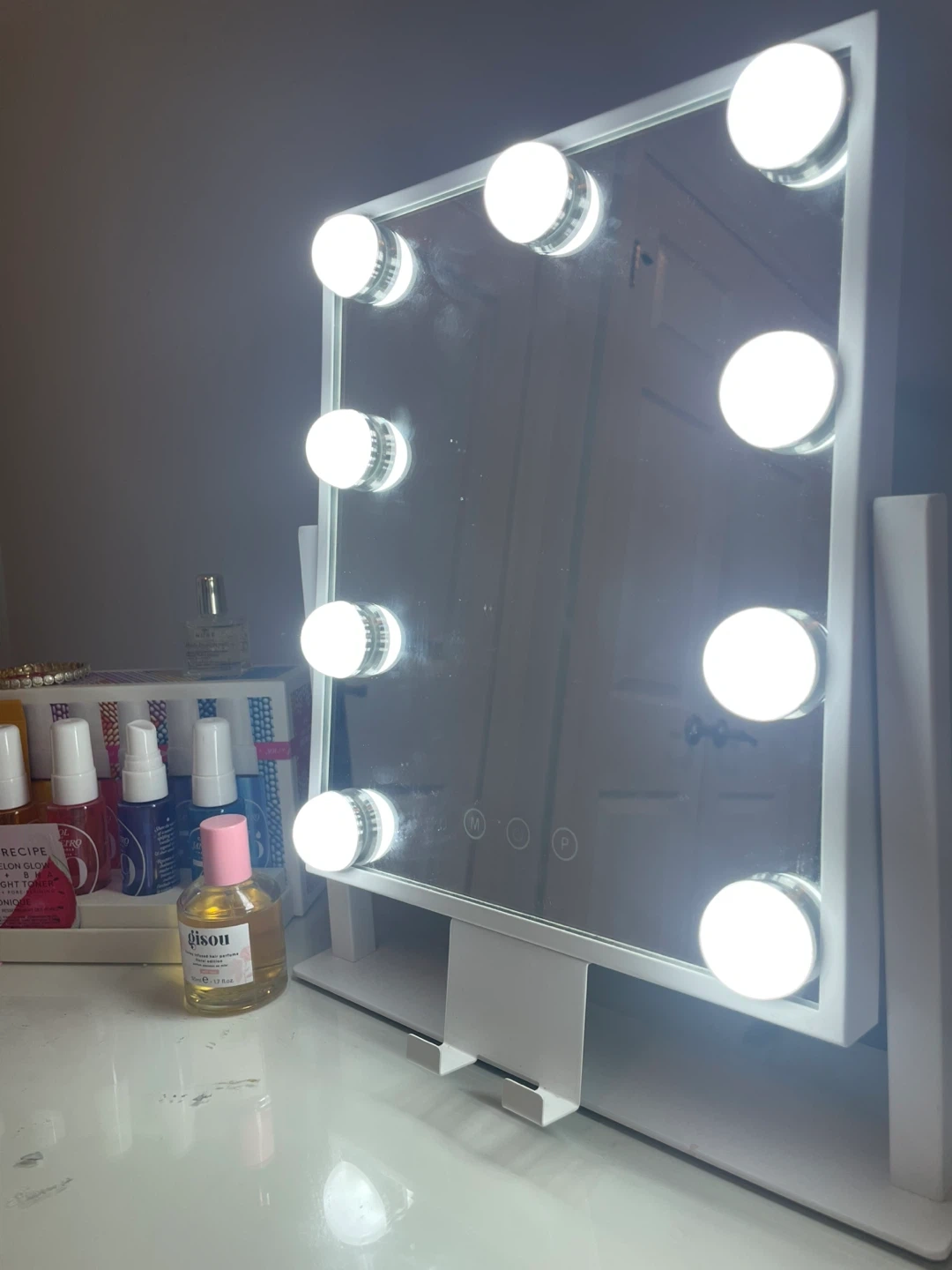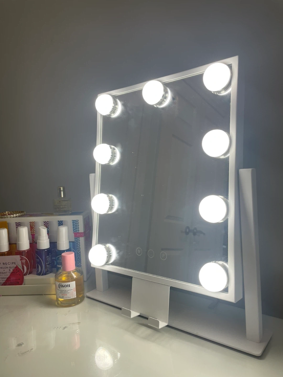 A white Hollywood-style vanity mirror featuring 10 bright LED bulbs. It has a stable stand for countertop use. Perfect for applying makeup or styling hair with proper lighting!