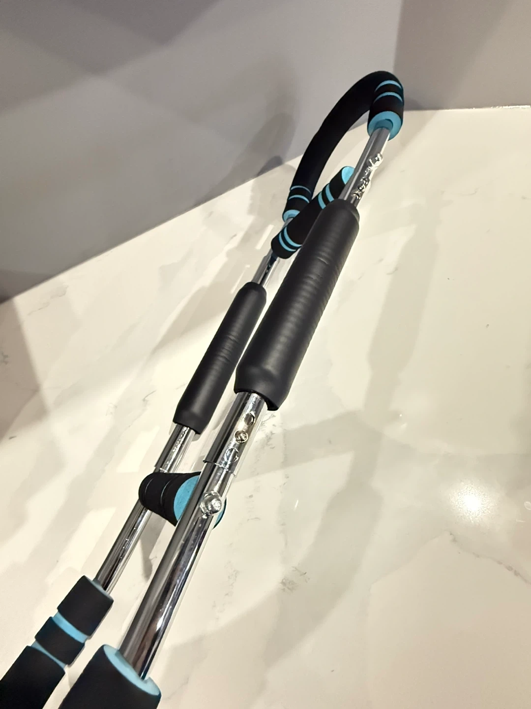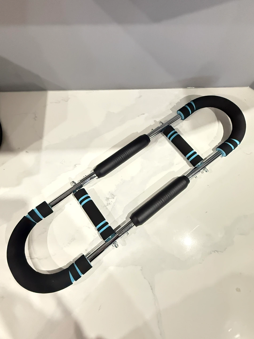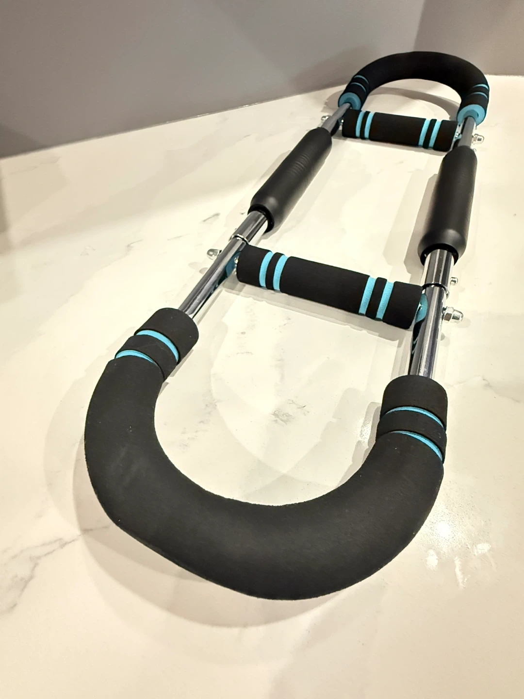 Durable core workout bar. Has comfy foam handles with blue accents. Great for ab exercises and building strength. Easy to use at home.