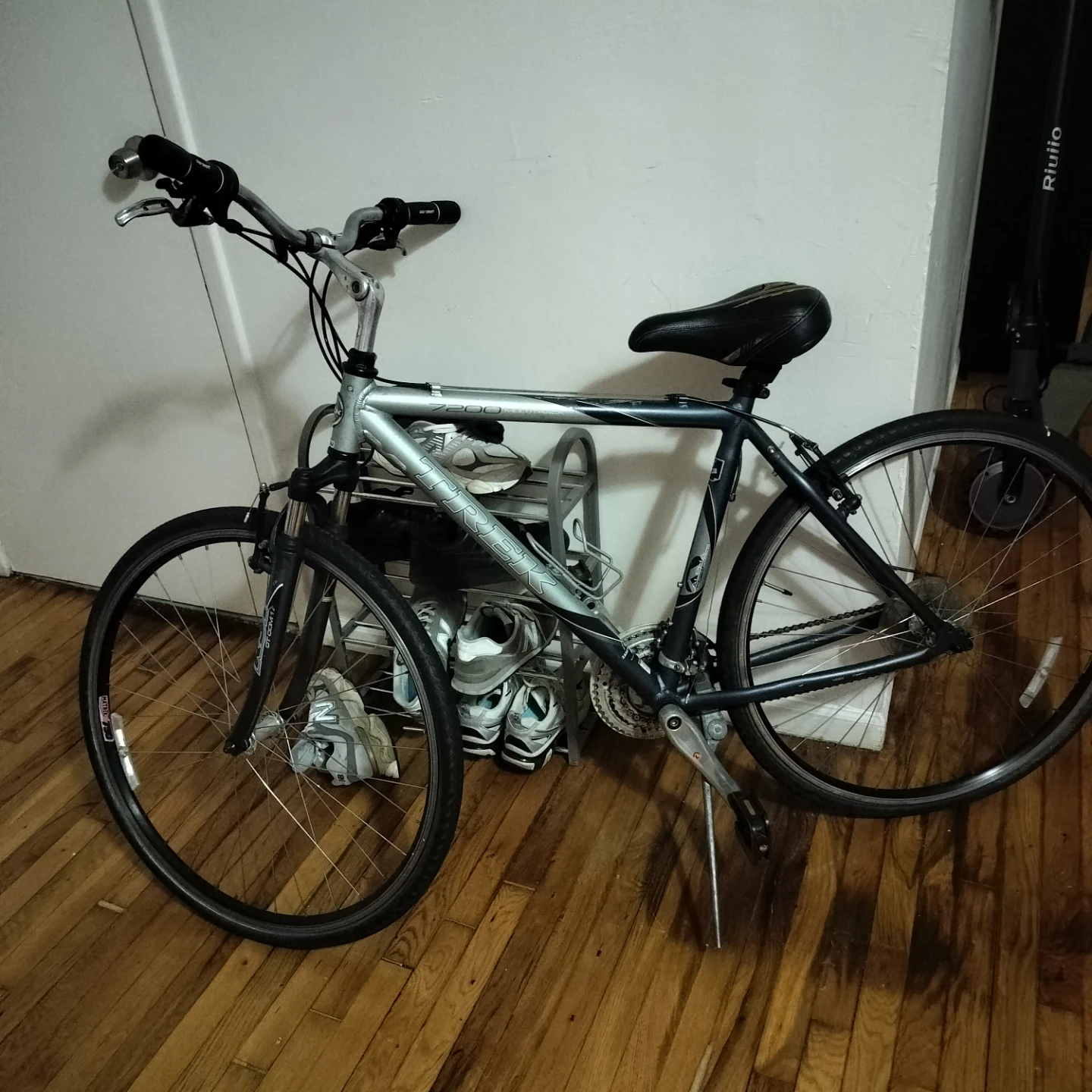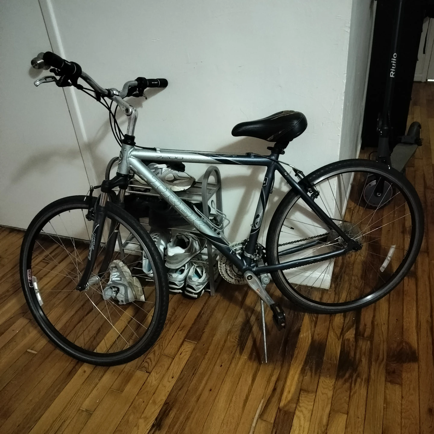 Silver and blue Trek 700 hybrid bike. Features a comfortable seat and sturdy frame. It's ready for your commute or weekend rides!