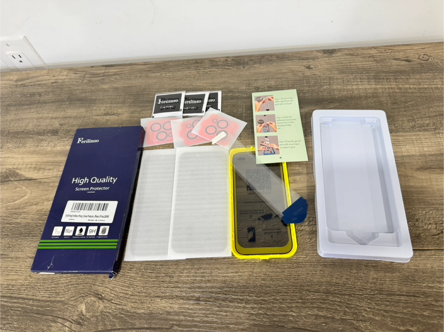 This is a pack of Ferilinsso high-quality screen protectors designed for the iPhone 16 Pro Max. It includes tempered glass screen protectors and camera lens protectors. The pack also comes with an installation frame to help with proper alignment. It's slim and offers 9H hardness for durability.
