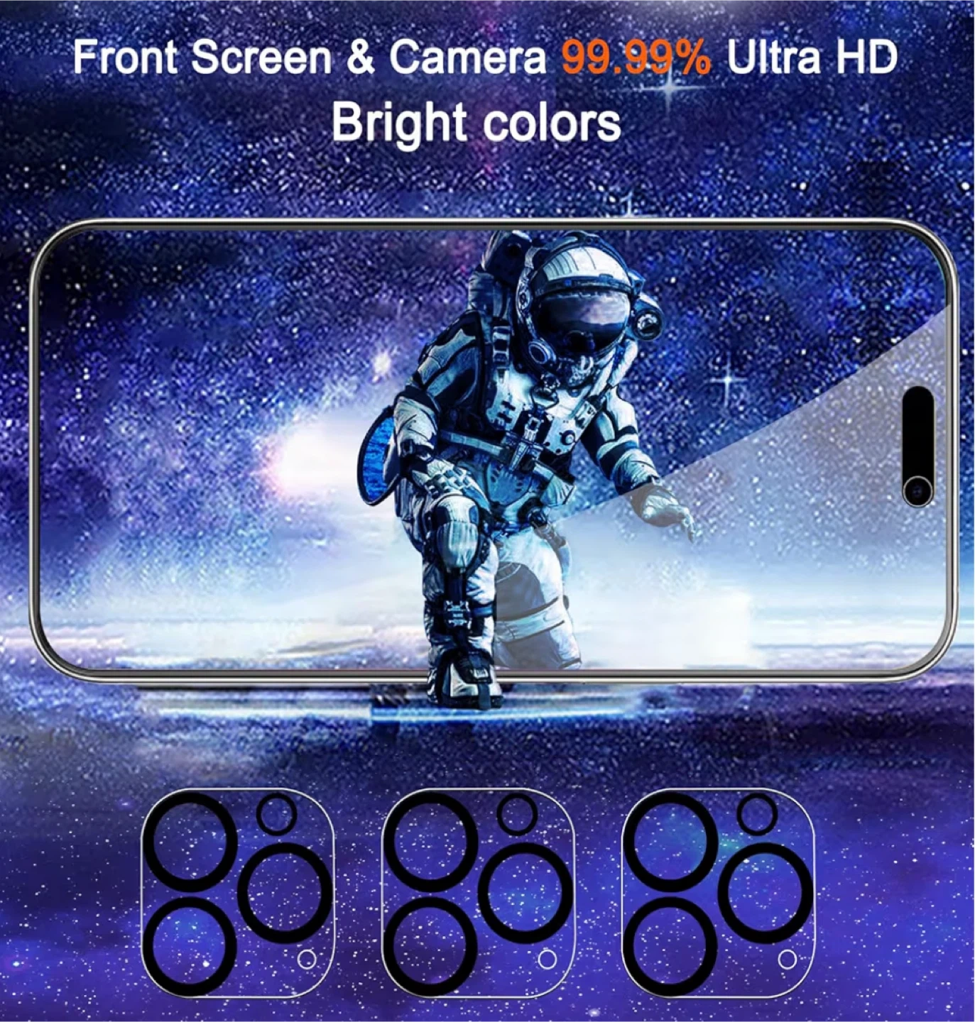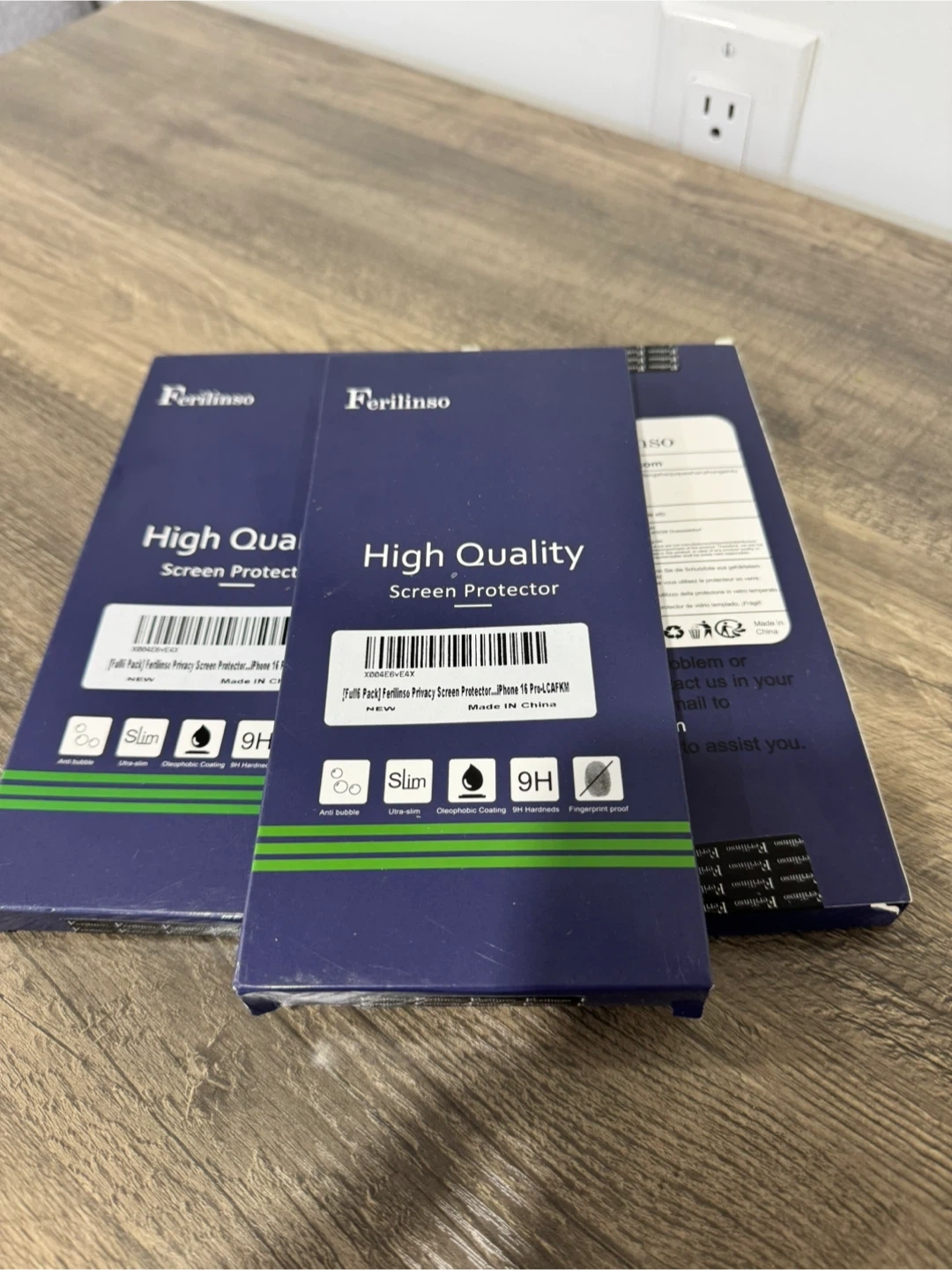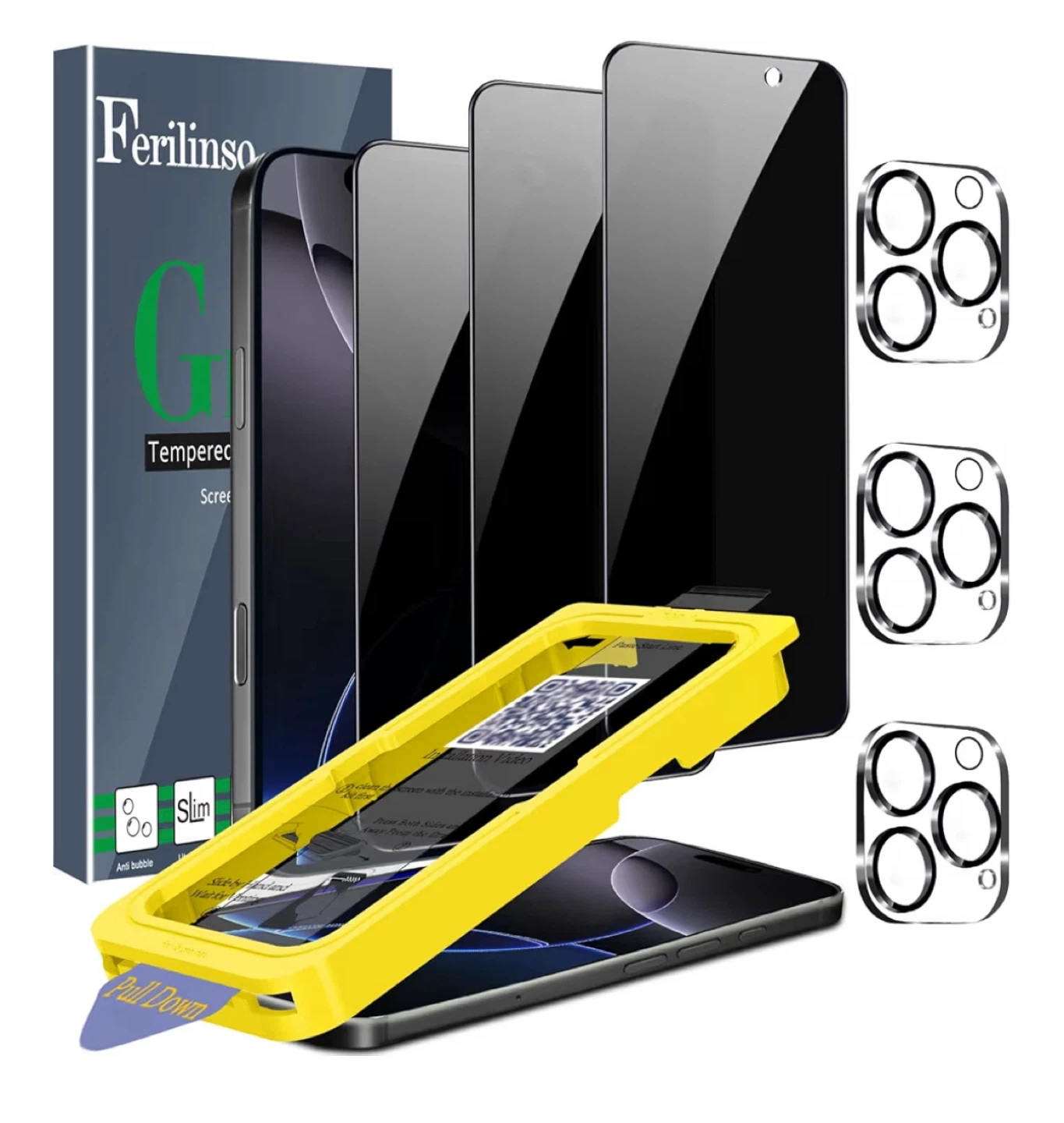 This is a pack of Ferilinsso high-quality screen protectors designed for the iPhone 16 Pro Max. It includes tempered glass screen protectors and camera lens protectors. The pack also comes with an installation frame to help with proper alignment. It's slim and offers 9H hardness for durability.