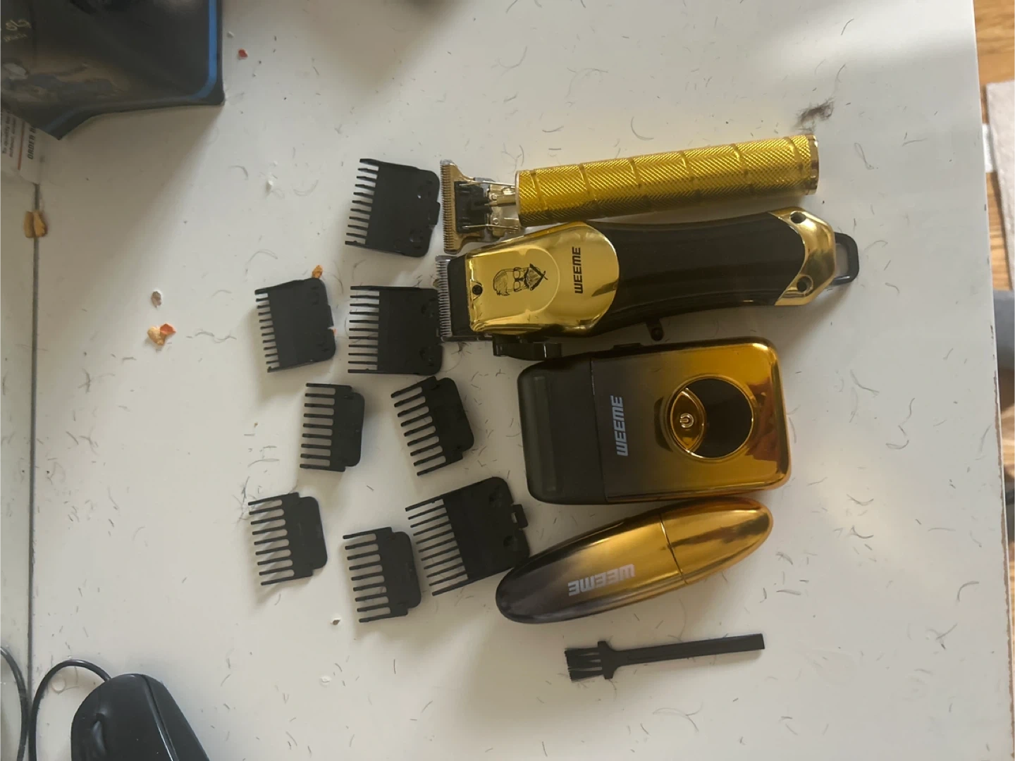 This WEEME hair clipper and trimmer set comes in a stylish gold and black finish. It includes the main clipper, a smaller trimmer, a charging base, and multiple guide combs. Also comes with a cleaning brush.