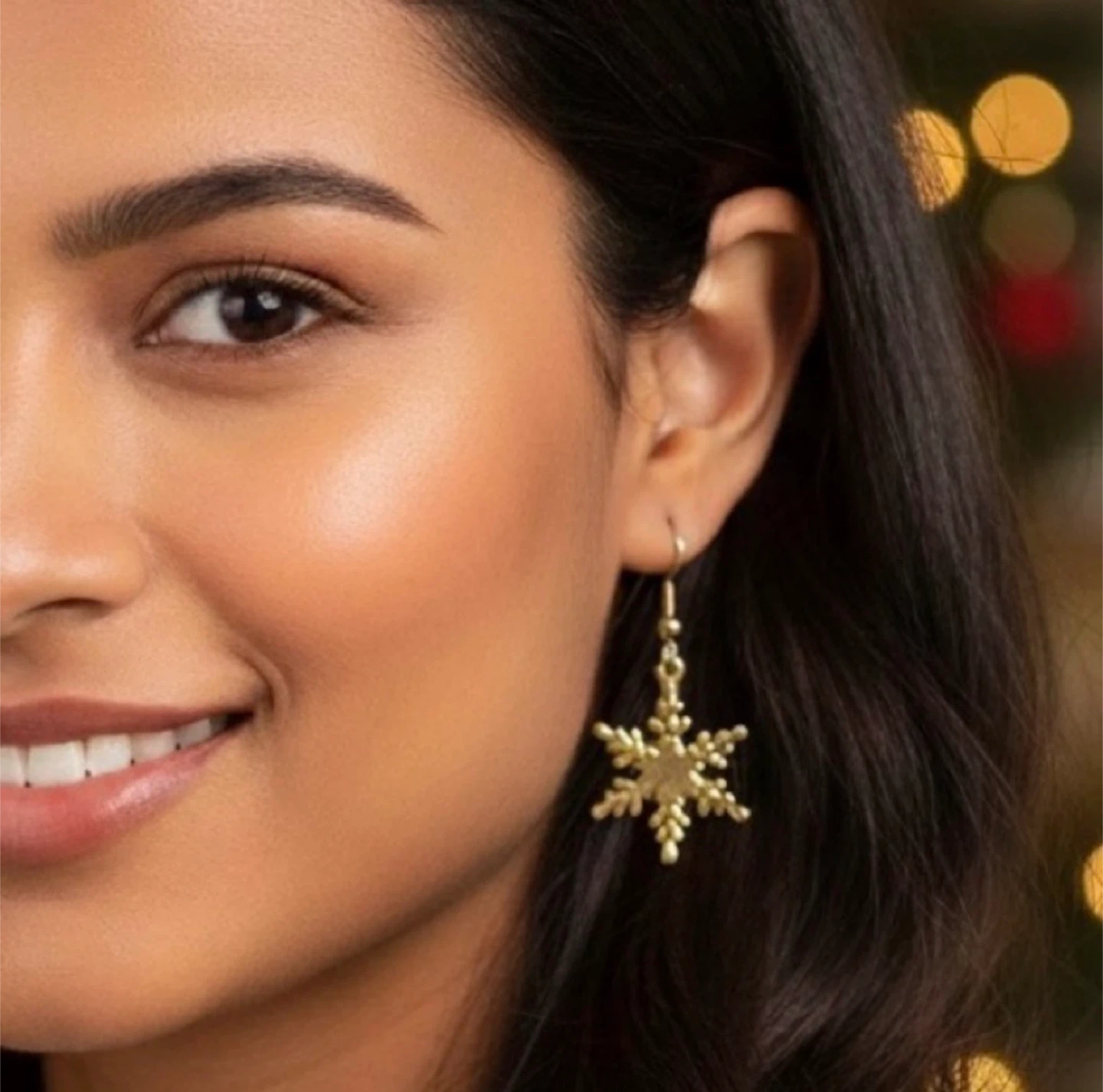 Delicate and lightweight gold-tone snowflake dangle earrings on shepherd hooks. Perfect minimalist jewelry for winter, Christmas, or seasonal wear.