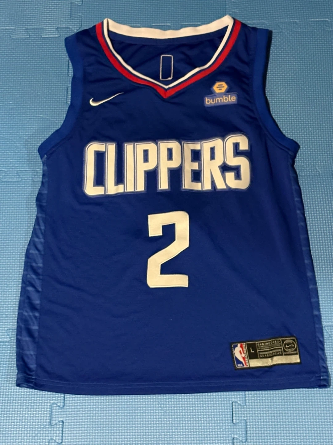 This is a men's size large LA Clippers basketball jersey featuring Kawhi Leonard's name and number. It's made by Nike and has the bumble sponsor logo. The jersey is blue with white lettering and trim.