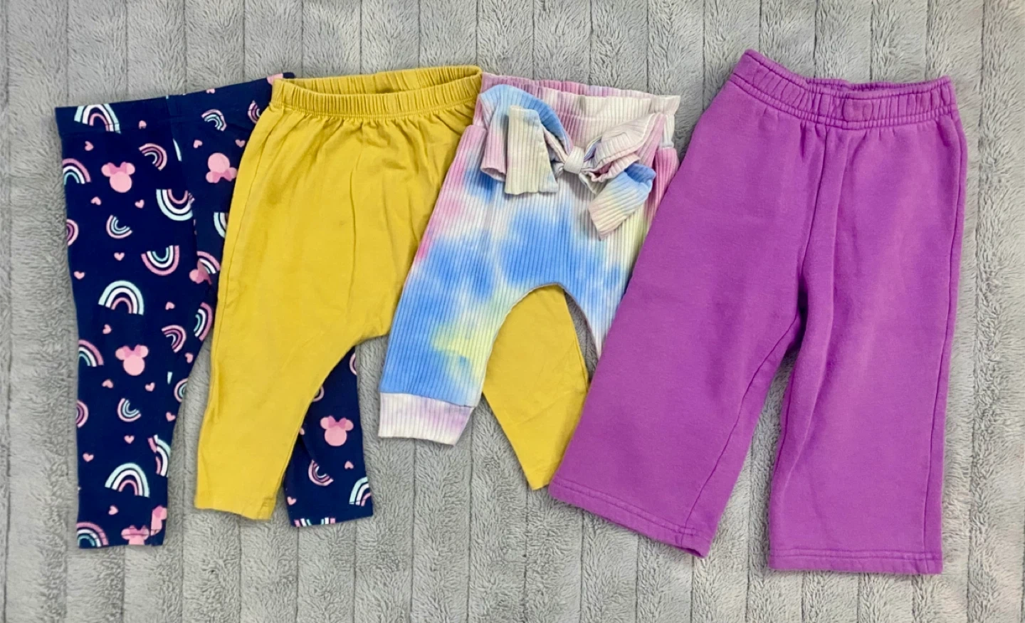 12-18 month girls pants lot. Tights and sweatpants in this bundle. The tie dye one has bow on back I wanted to show in photo. Old Navy, George and Disney baby brands.