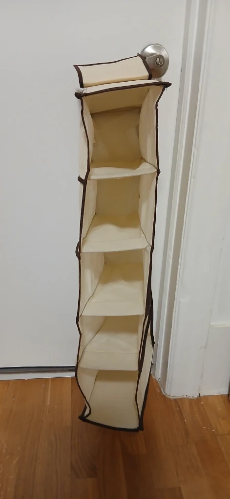 Beige fabric hanging shelf organizer with brown trim. It has five open compartments for storage.