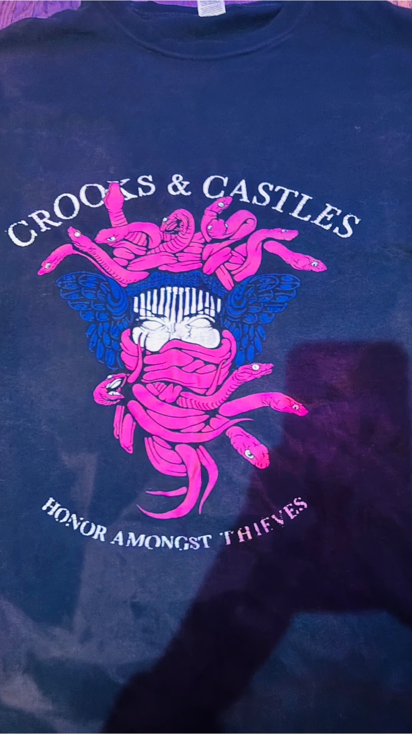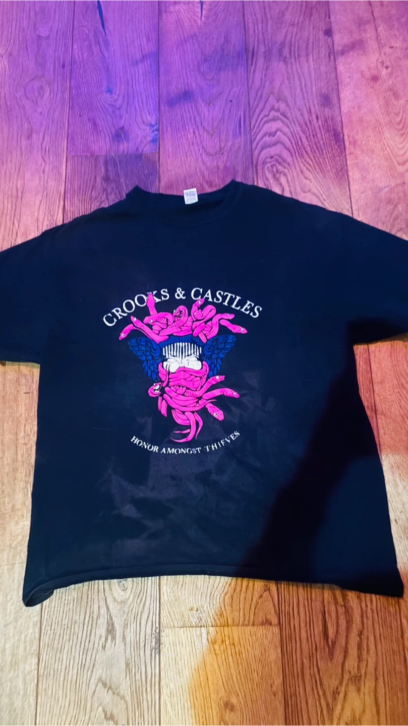 This is a Crooks & Castles t-shirt with a graphic print on the front. It features the "Honor Amongst Thieves" slogan. The shirt is black with a vibrant pink and blue design.