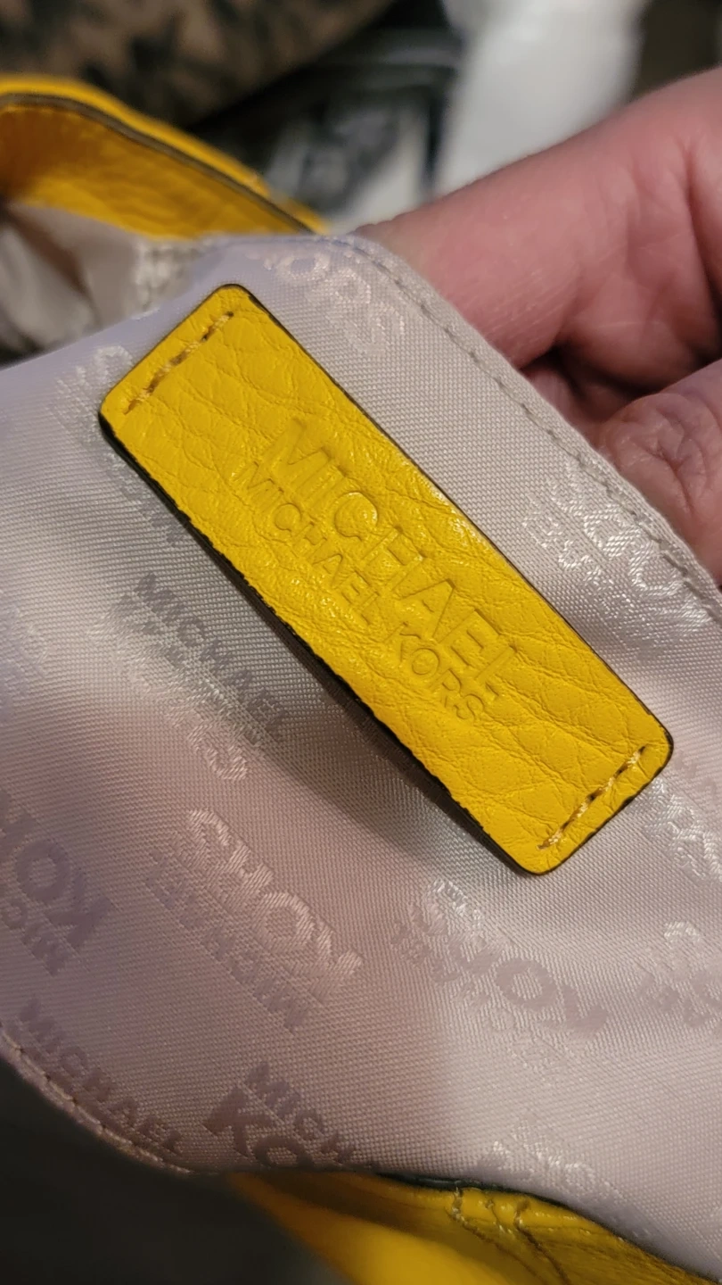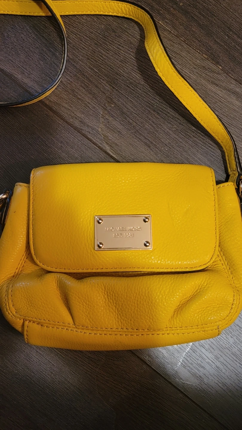 This is a gorgeous vibrant yellow Michael Kors crossbody bag. It's made of pebbled leather. The interior lining features the Michael Kors logo pattern.