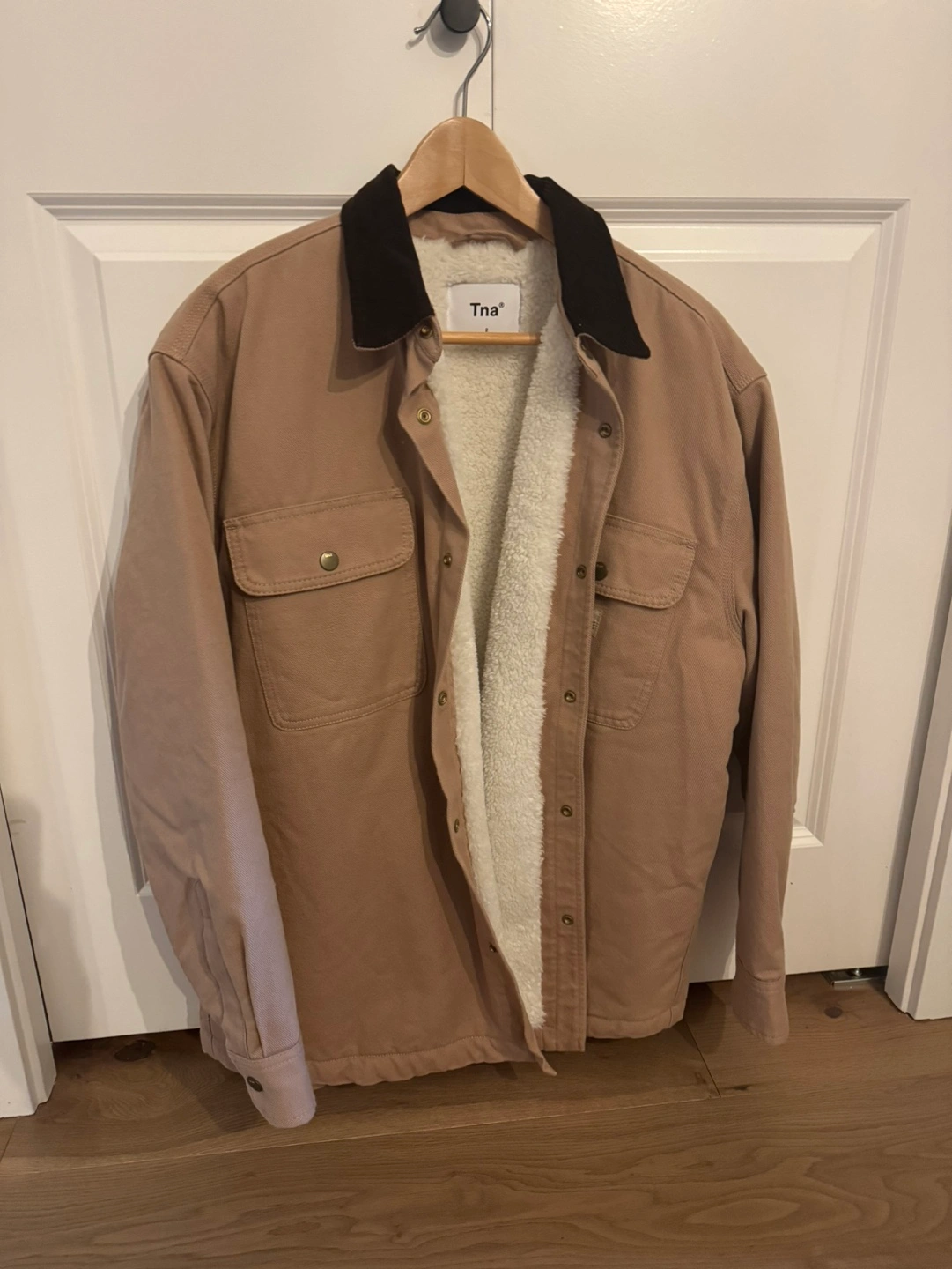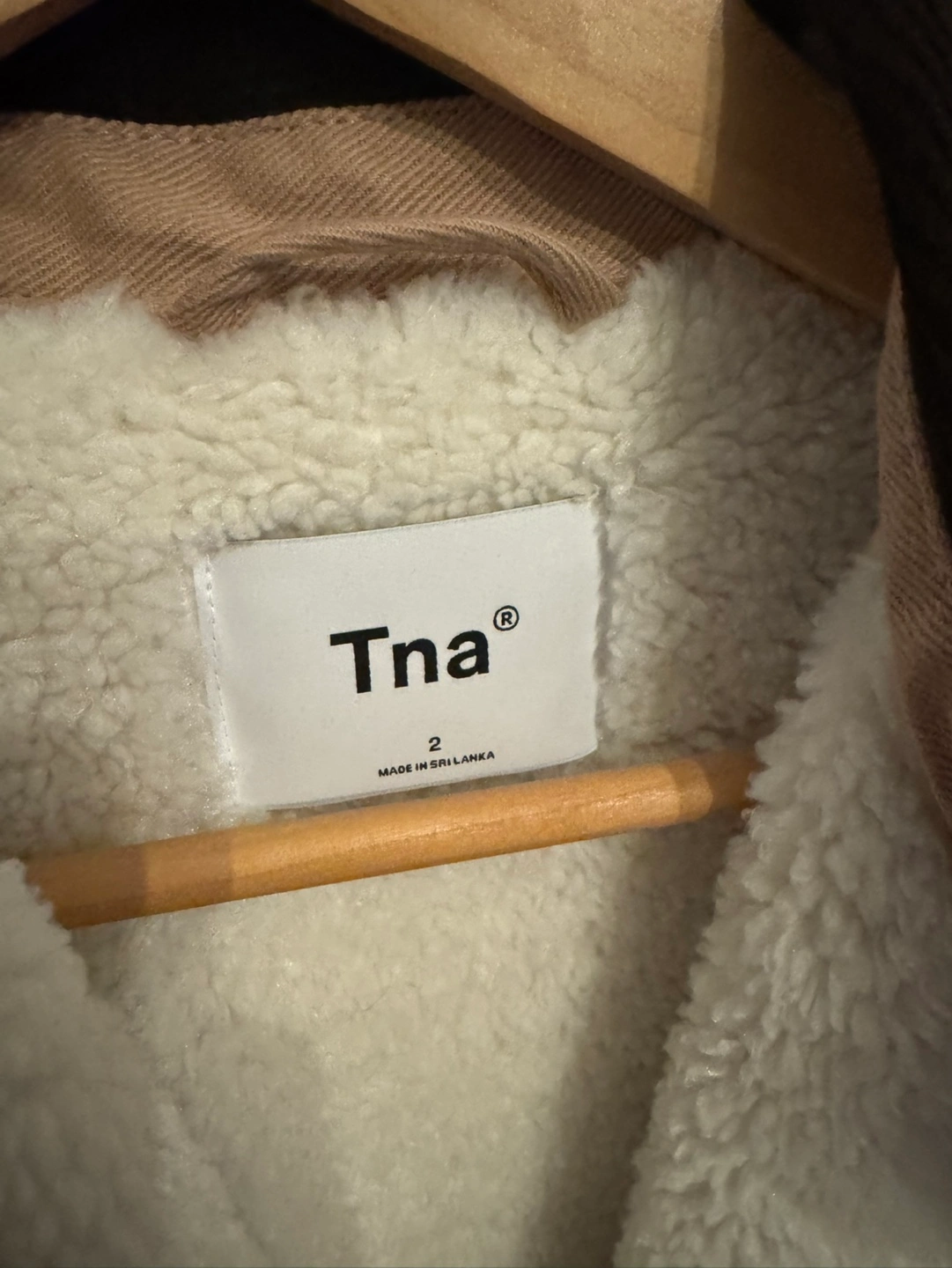 Cozy Tna sherpa jacket in a tan colour! It's a size 2 (oversized) and features a soft sherpa lining to keep you warm. Perfect for layering during the cooler months. The jacket is in excellent condition with a dark brown corduroy collar.