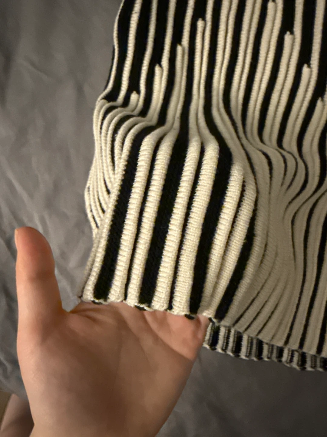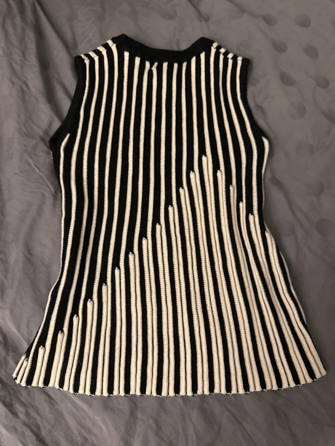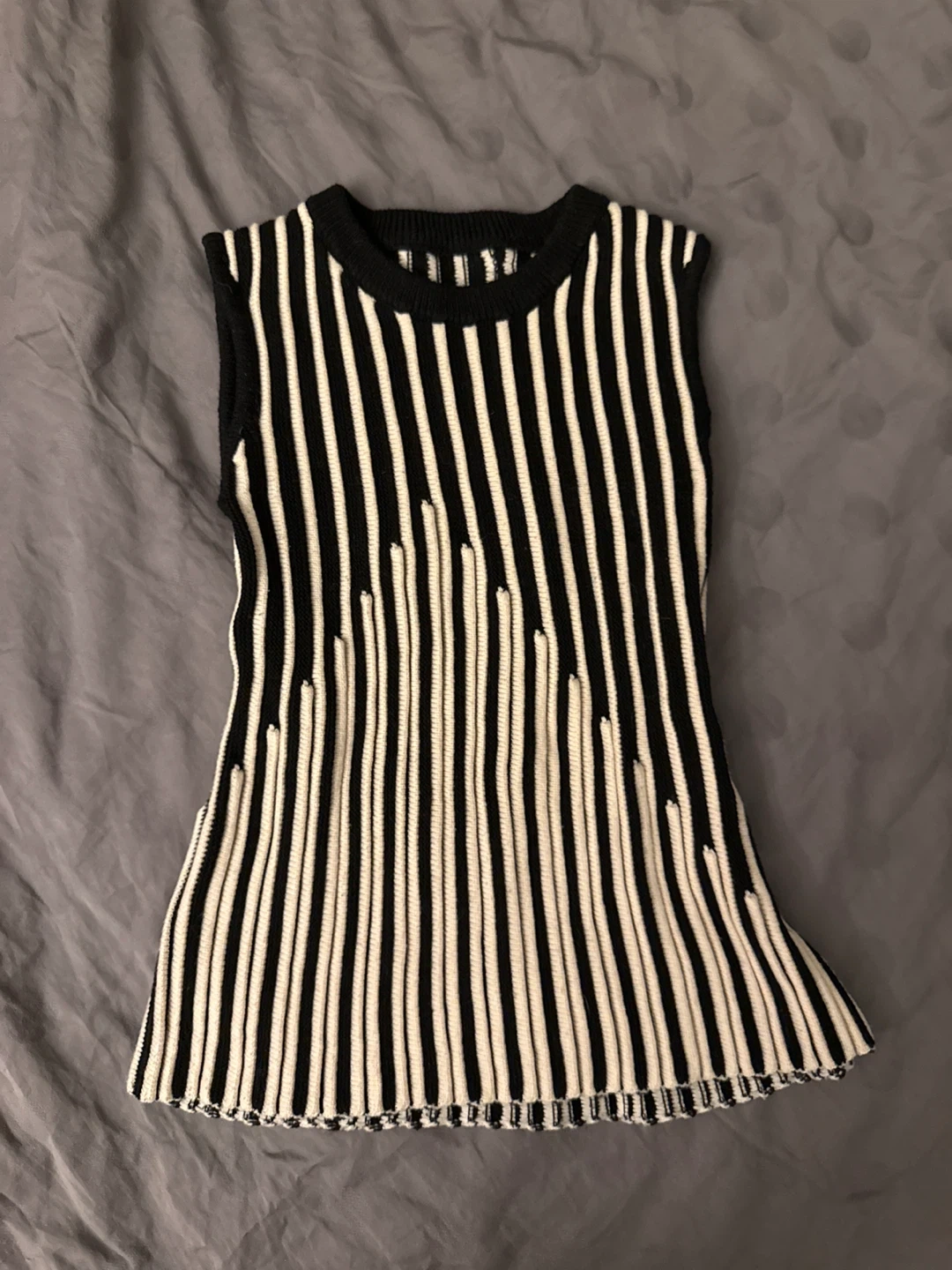 Sleeveless knit top with a black and white vertical stripe pattern. It's made of a ribbed knit material. Perfect for layering or wearing on its own! Very stretchy