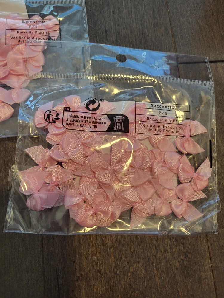 Three packages of small pink satin bows. Perfect for crafts, scrapbooking, or gift wrapping. Untouched and still in original packaging.