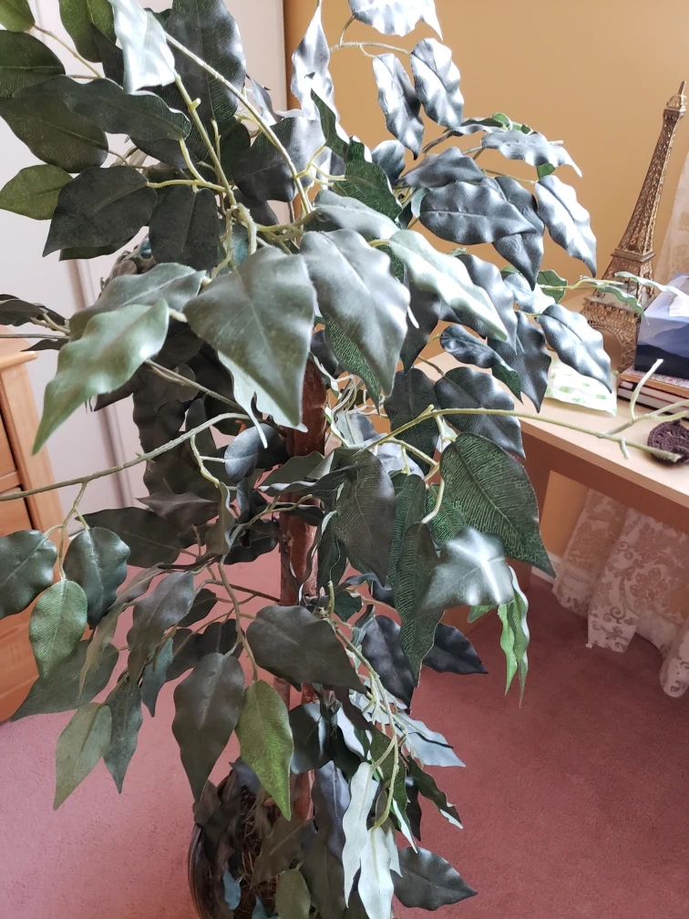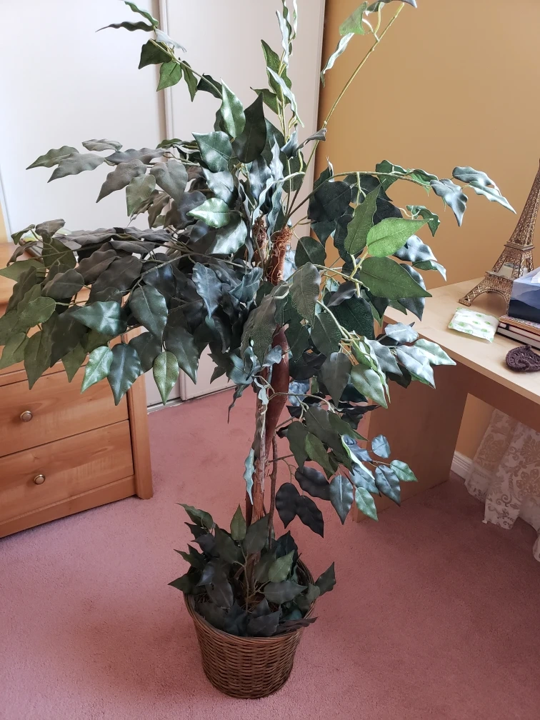 Large artificial ficus tree. Planted in a brown woven basket. Looks realistic. Great for home decor.