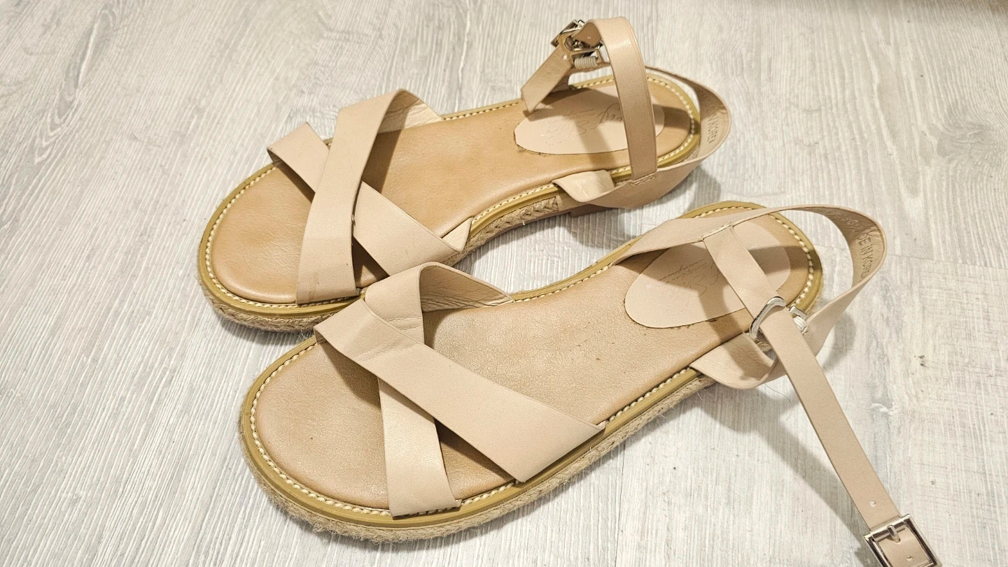 These stylish beige sandals feature a strappy design with an ankle buckle. They have a comfortable espadrille sole.
