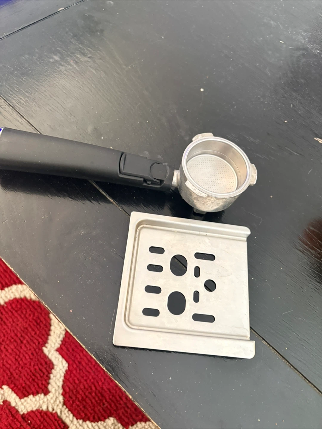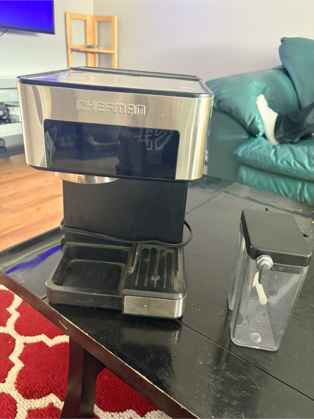 This is a Chefman espresso machine. It includes the portafilter and a drip tray insert. The water reservoir has some damage (it’s cracked) but is still functional. I recently got a new machine so no longer need this