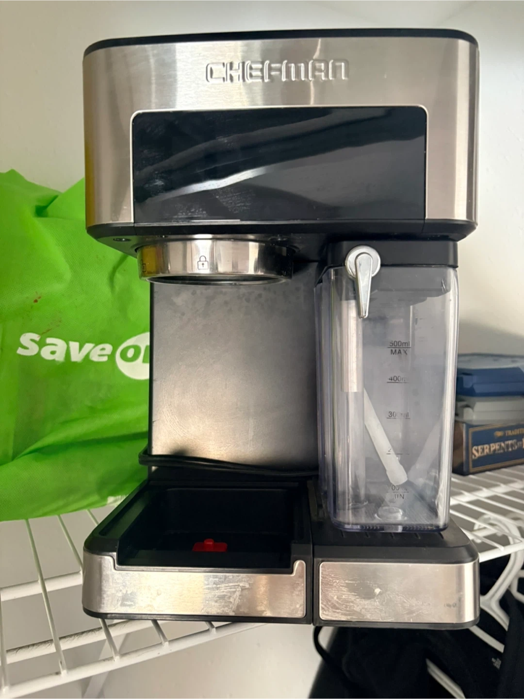This is a Chefman espresso machine. It includes the portafilter and a drip tray insert. The water reservoir has some damage (it’s cracked) but is still functional. I recently got a new machine so no longer need this