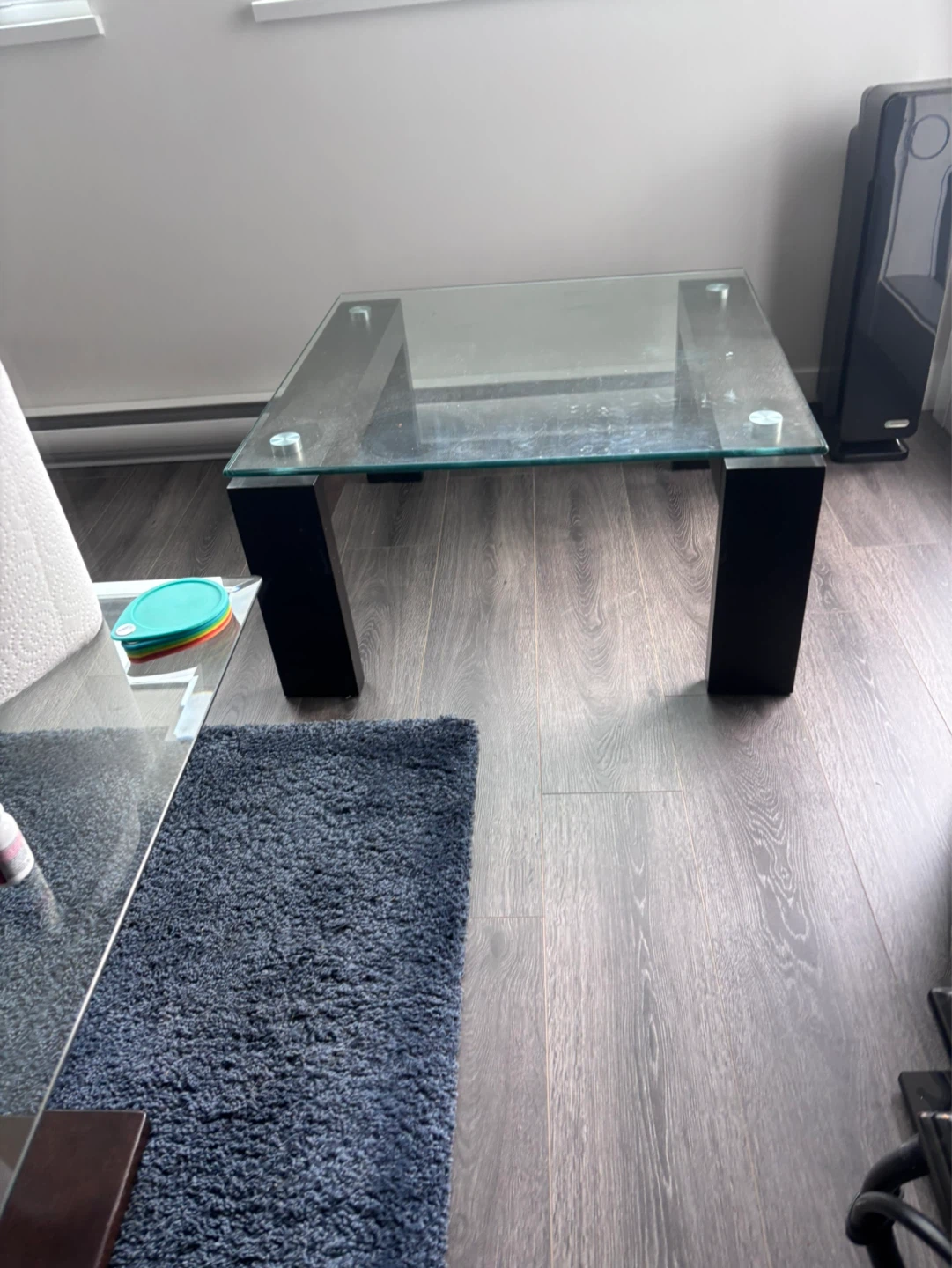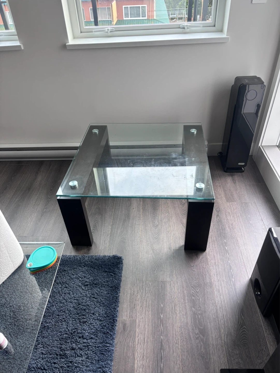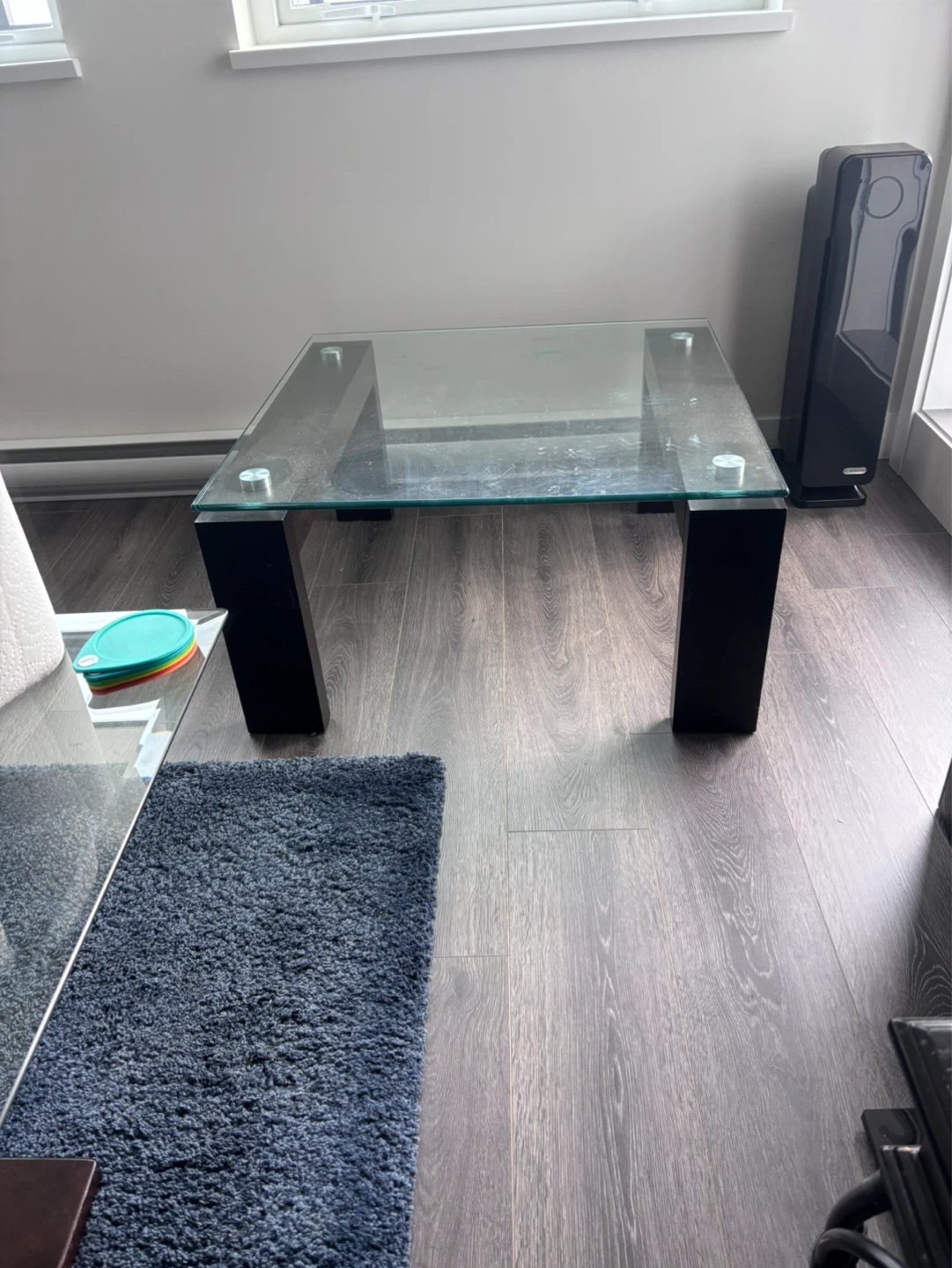 Square glass top coffee table with black block legs. The top is clear tempered glass. It's a simple, modern design that'll fit most living rooms. It's a sturdy coffee table for everyday use.
