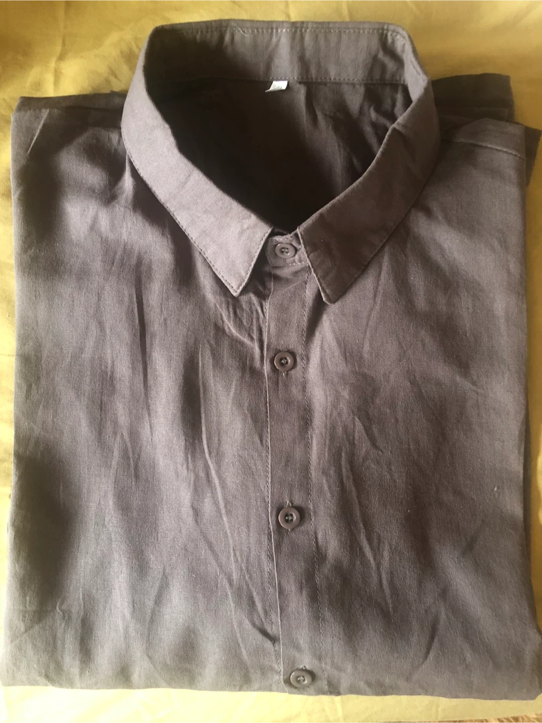 This is a dark grey cotton collared shirt with a button-up front. It appears to be made of a breathable fabric. Great for casual or semi-formal wear!