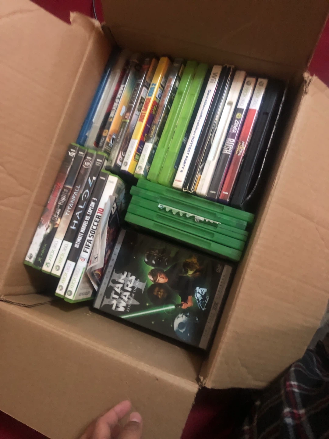 This is a collection of various video games for Xbox 360, Wii, and DVD. It includes titles like Halo 4, Titanfall, FIFA Soccer 10, Ultimate Marvel vs. Capcom 3, Star Wars: Return of the Jedi, Zumba Rush, and Just Dance 4. The games are in their original cases, and some are stacked in a box.