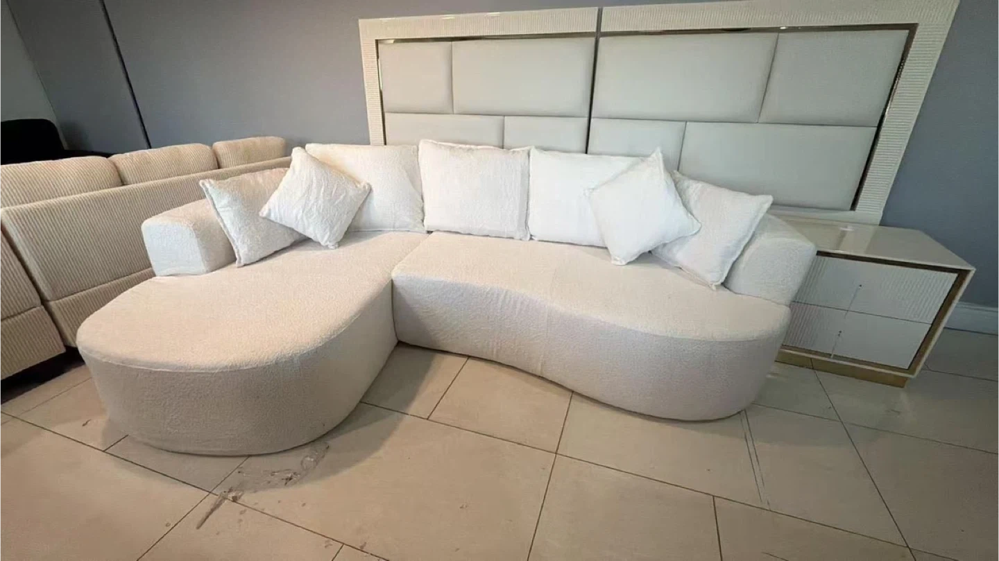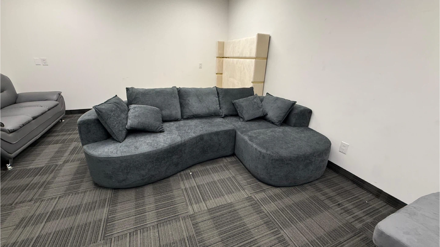 This curved sectional sofa offers a unique, modern design. It's upholstered Compressed sofa available in dark grey, light grey and creme. Super comfortable. Available in right and left.