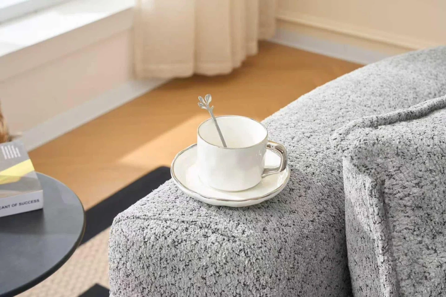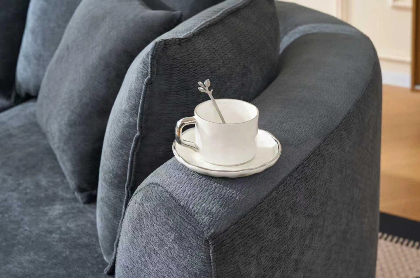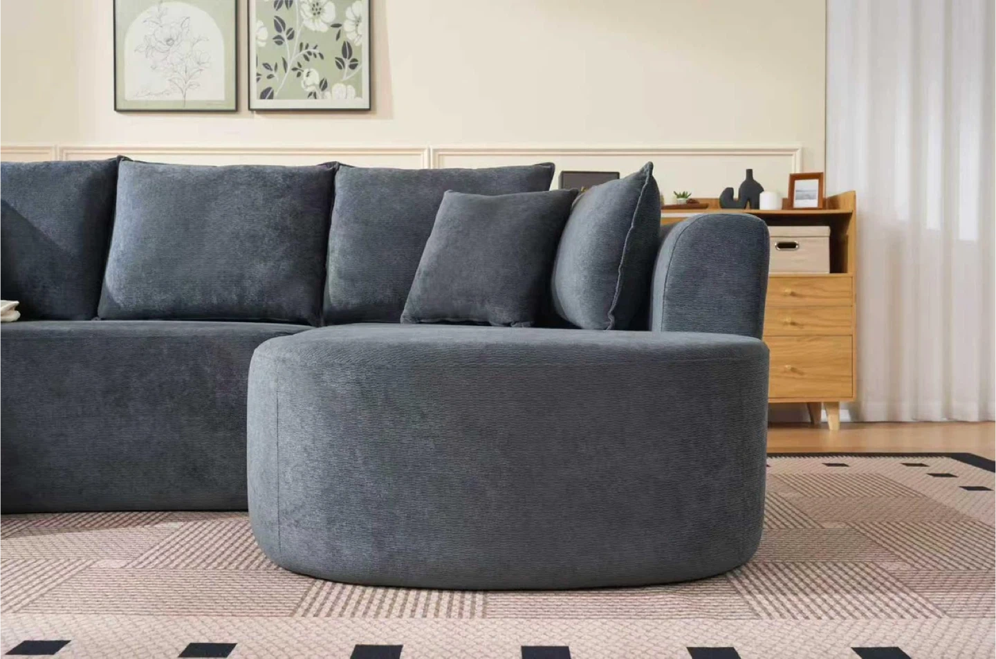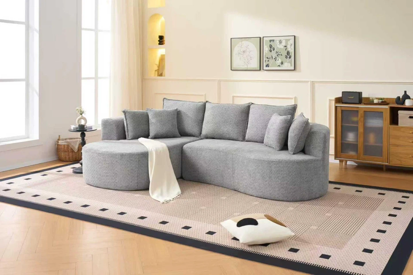 This curved sectional sofa offers a unique, modern design. It's upholstered Compressed sofa available in dark grey, light grey and creme. Super comfortable. Available in right and left.