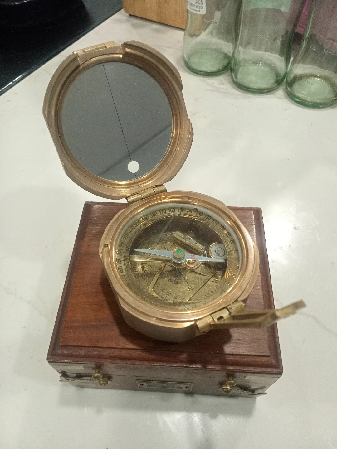 This is a K&R brass compass with a mirror and a wooden case. The case has "K&R Since 1928" inscribed on it. The compass features a "Natural Sine" table on the lid. It's a beautiful piece for navigation enthusiasts!