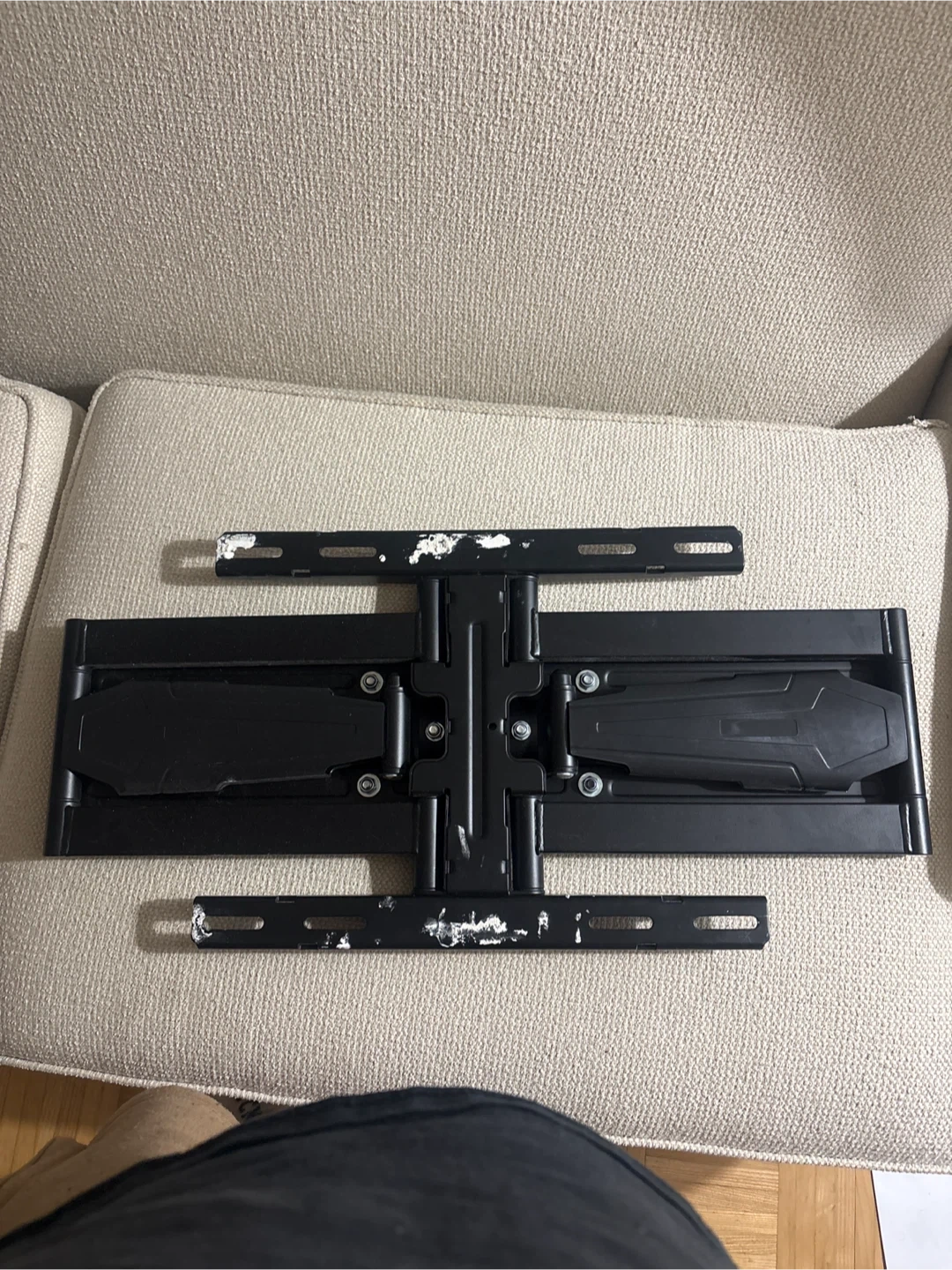 This is an Insignia full-motion TV wall mount. It's black and made of metal. This mount allows for tilt, swivel, and extension of your TV. It comes with the necessary hardware for installation.