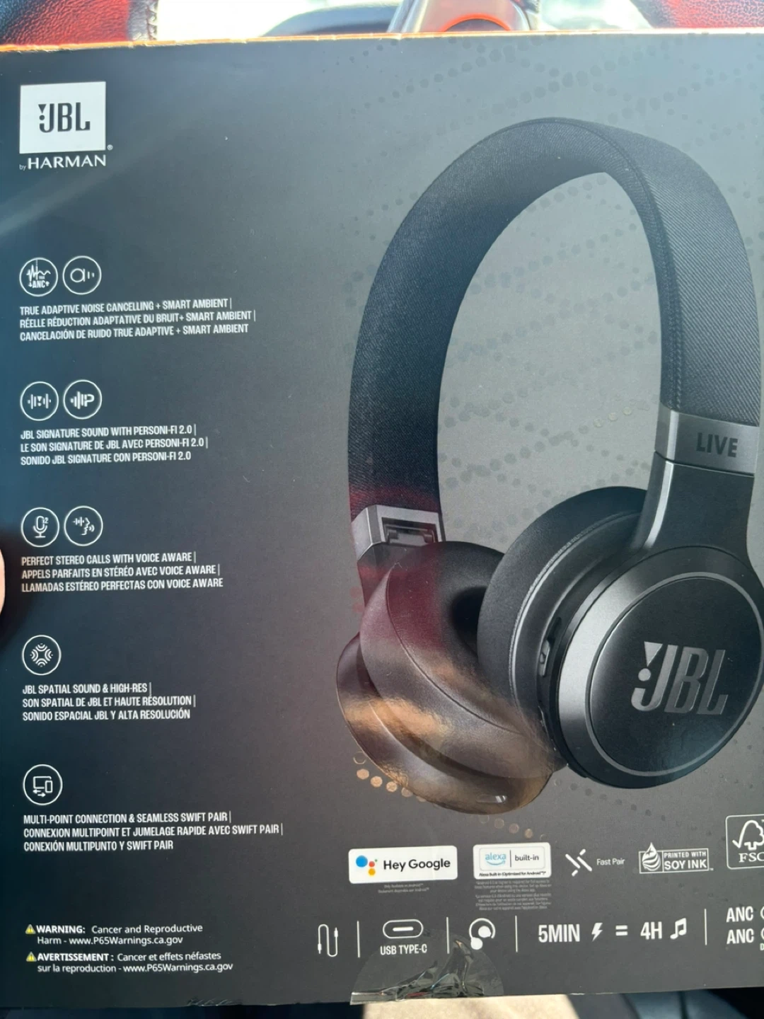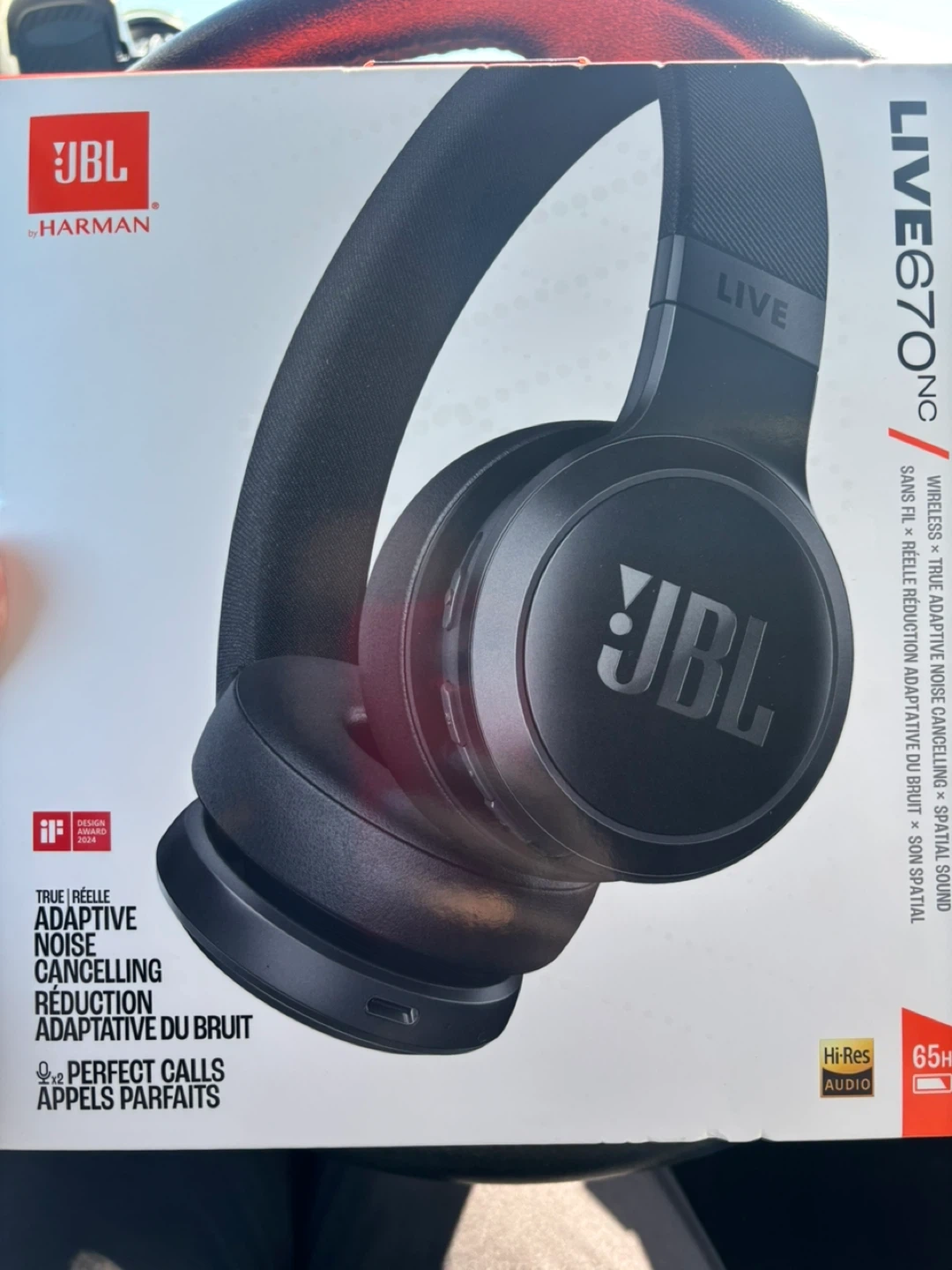 JBL LIVE 670NC wireless over-ear headphones with noise cancelling. They offer true adaptive noise cancelling and perfect stereo calls. Supports 5 minutes of charging for 4 hours of playback.