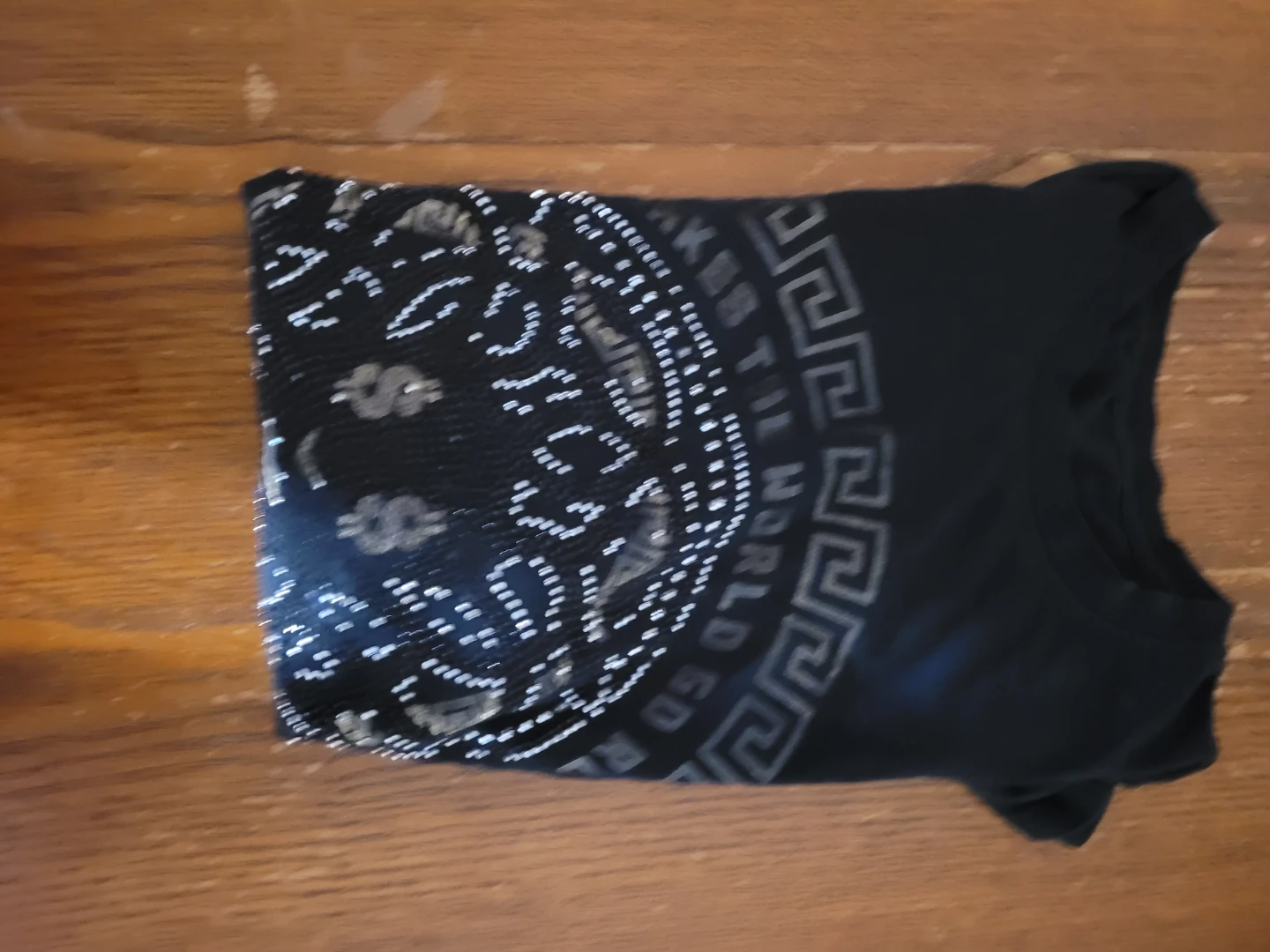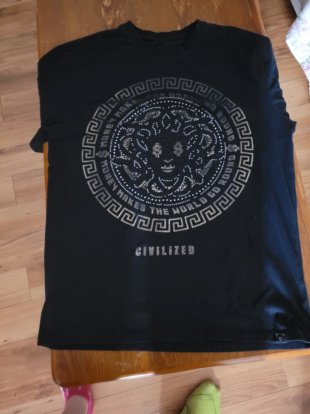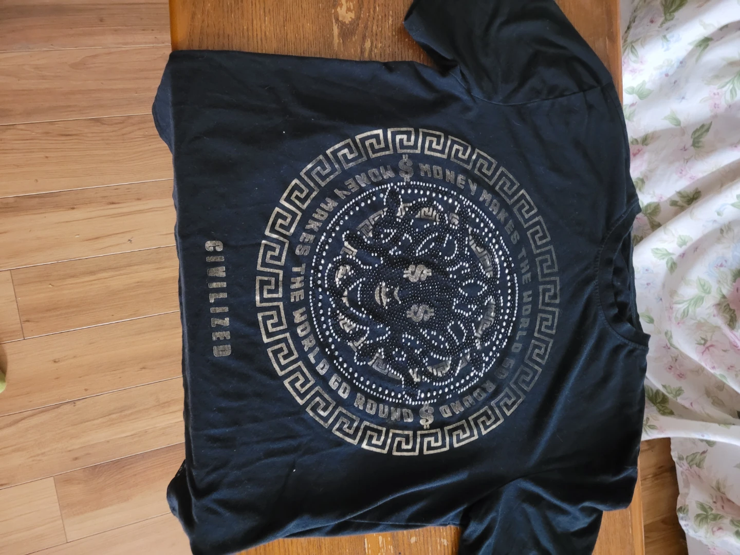 Civilized black t-shirt with a unique design. The shirt features a circular pattern with the text 'Money Makes the World Go Round'.