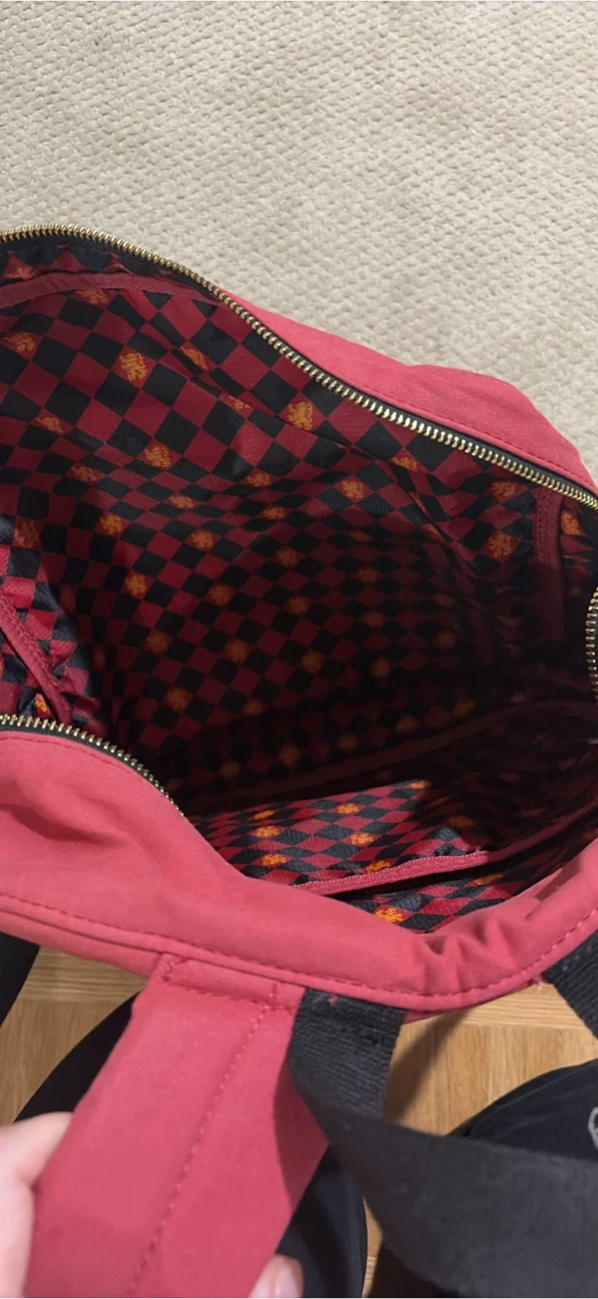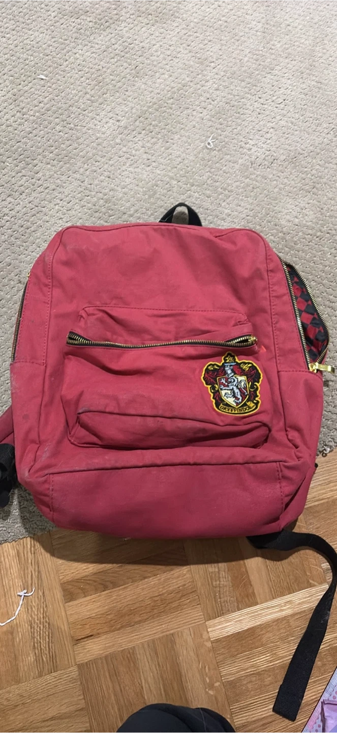 This Gryffindor backpack features the house crest. It has a large main compartment and a front zippered pocket. The inside lining has a checkerboard and golden snitch pattern. It's a fun bag for any Harry Potter fan!