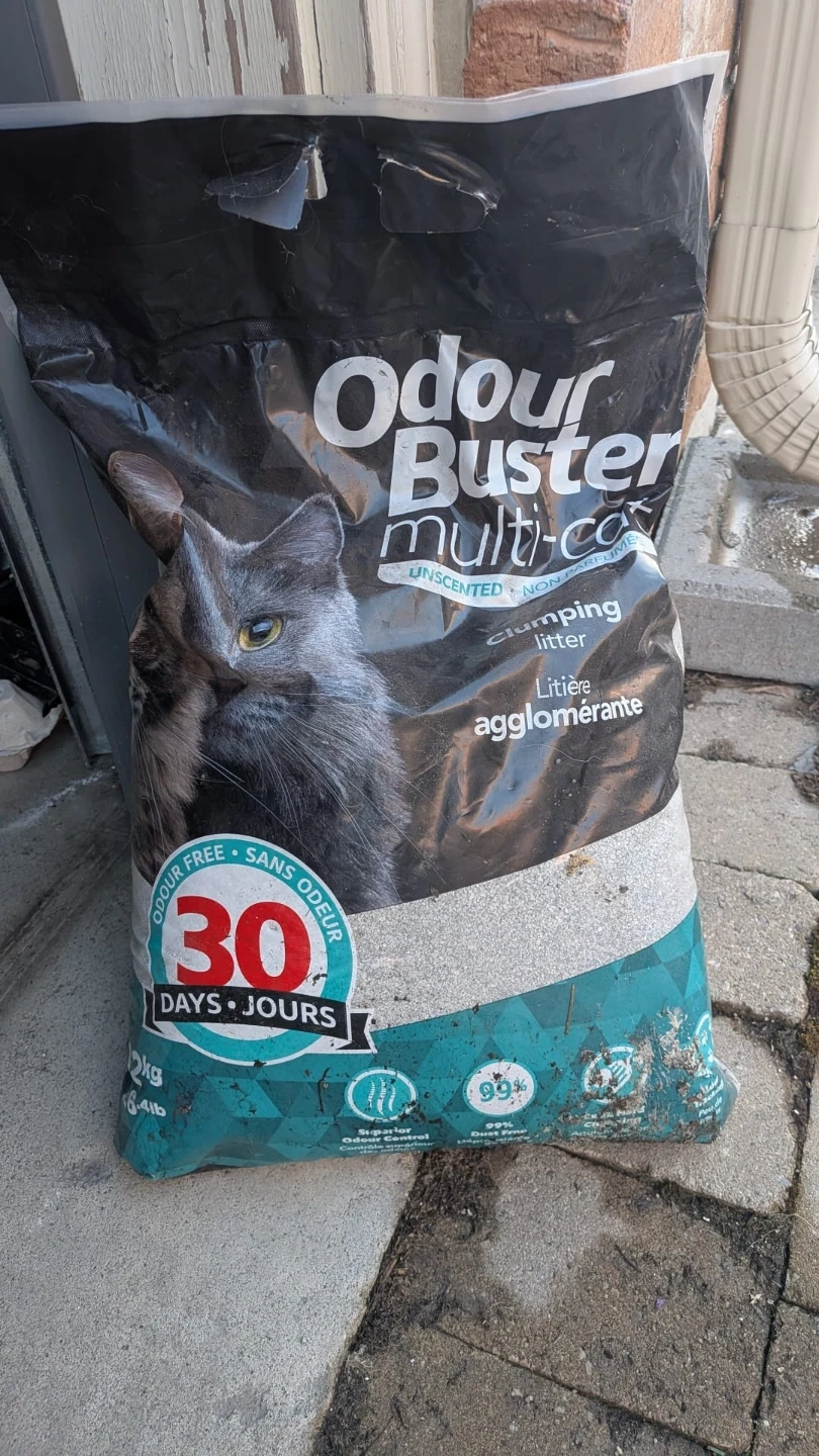 This is Odour Buster multi-cat clumping litter. It's unscented and offers 30 days of odour control. The bag contains 2kg (6.4lb) of litter. It's also 99% dust free!