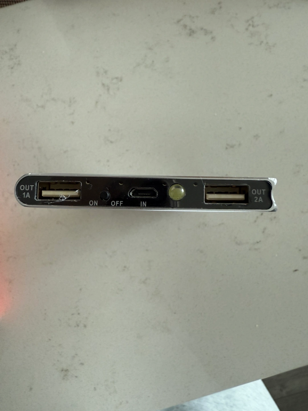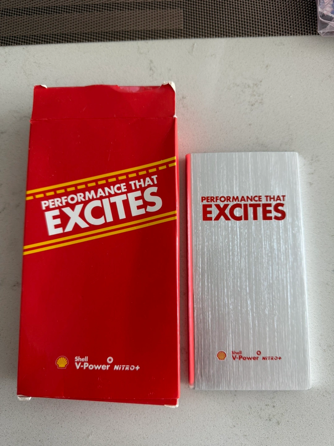 Vintage Shell V-Power Nitro+ branded portable charger. 10000mAh capacity. Features two USB output ports and one input port. Comes in original packaging.