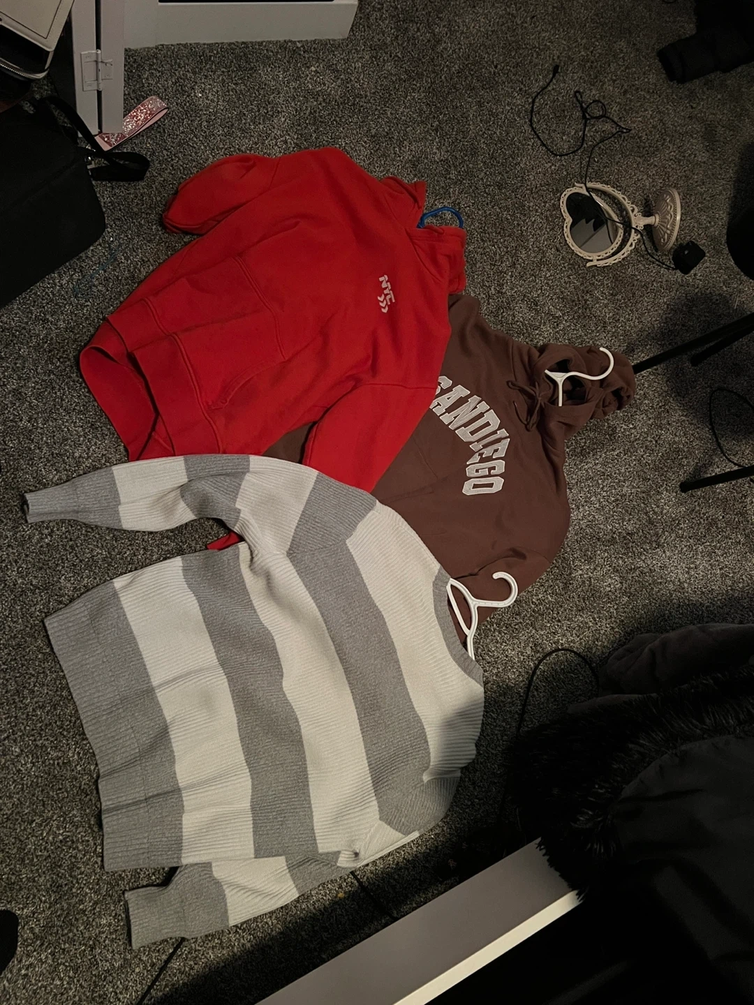 Bundle includes a red hoodie, a brown San Diego hoodie, and a grey and white striped sweater. Apparel is made of soft materials. Great for casual wear.
