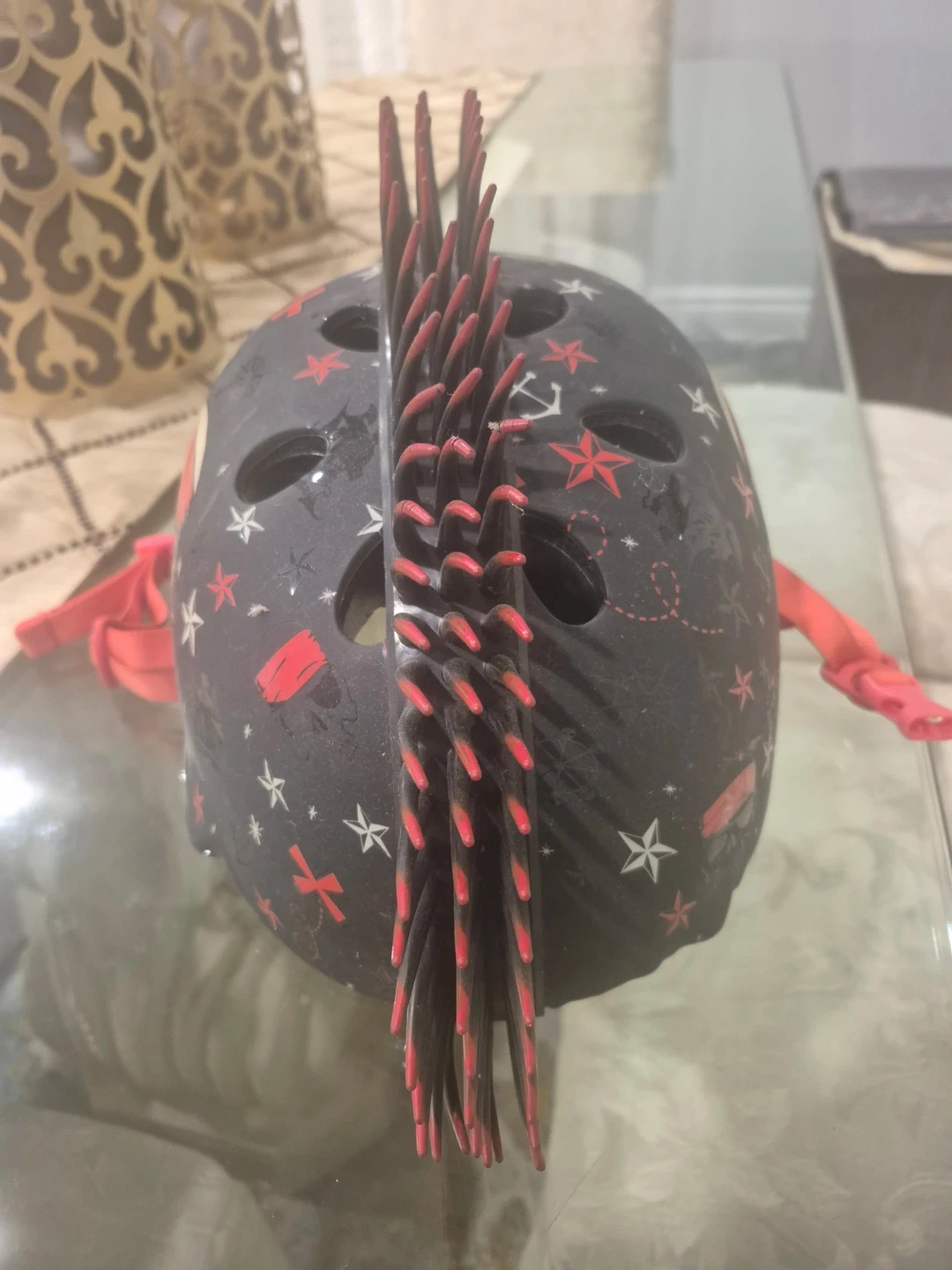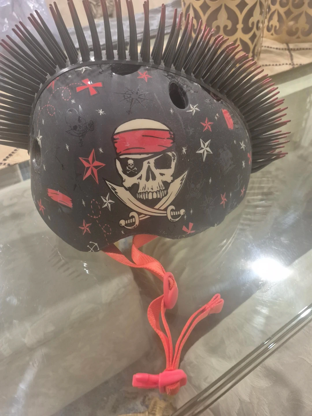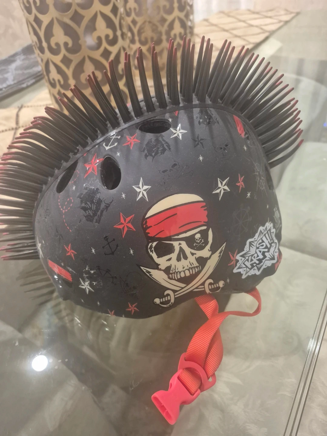Selling a youth-sized helmet, perfect for biking, skating, or scootering! It's a size M and features a cool pirate design with a skull and crossbones, stars, and anchors. Plus, it has a fun mohawk on top! The helmet is in good condition and ready for a new adventurer. Major intersection Brittania and tenth line in Mississauga