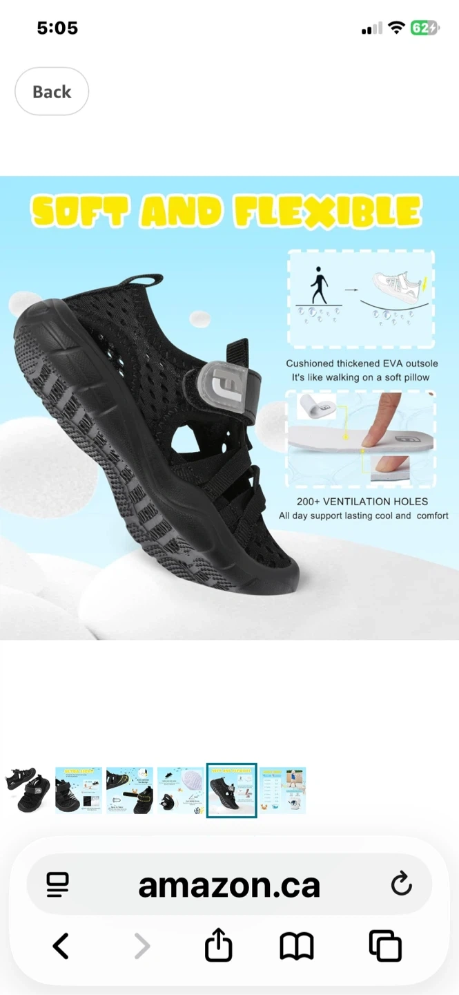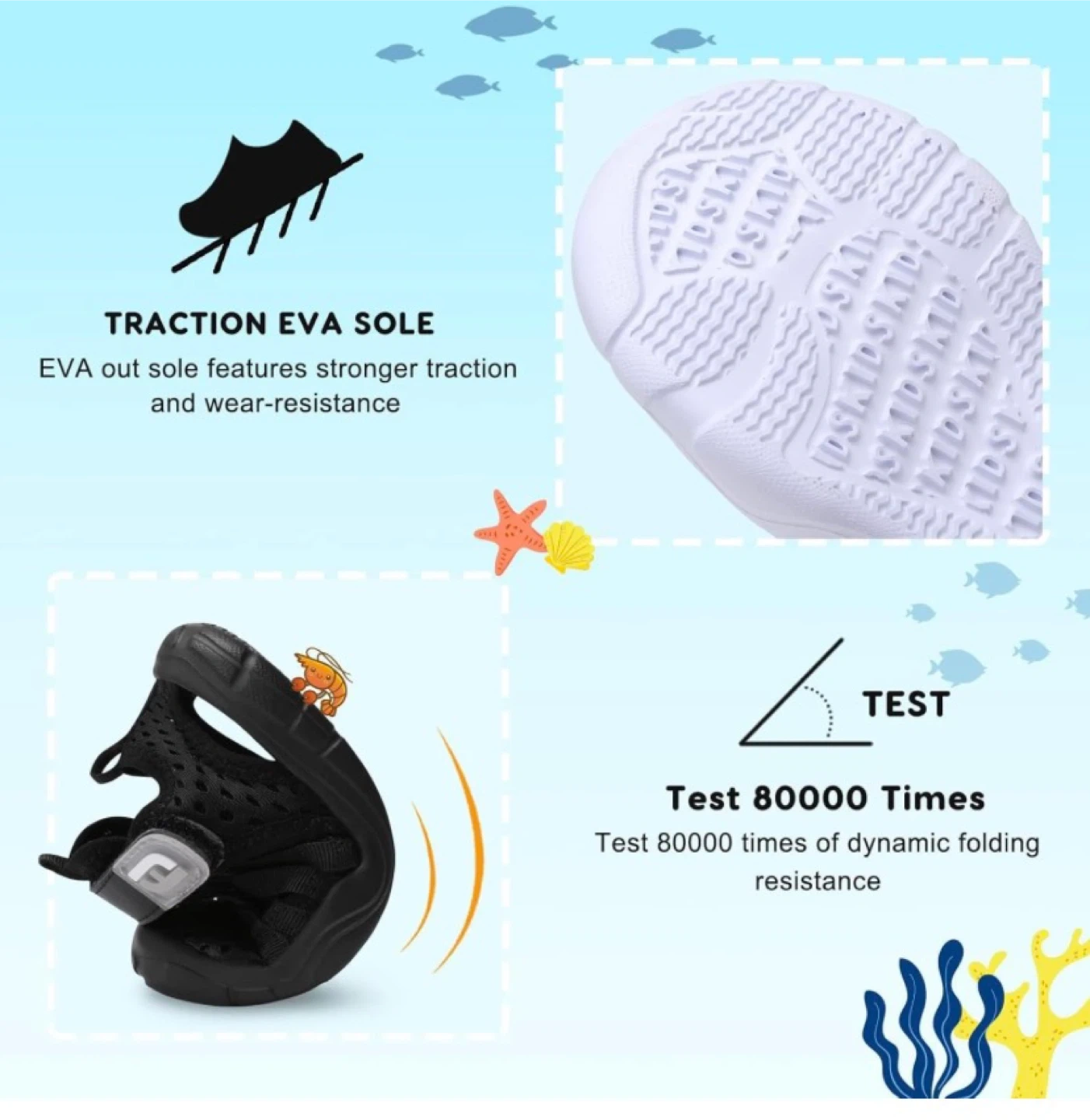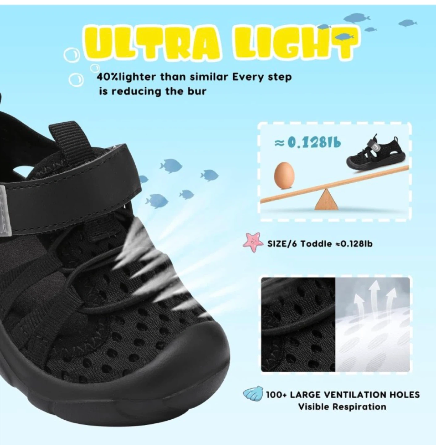 These black toddler sandals are ultra-lightweight and breathable with over 100 ventilation holes. They feature a traction EVA sole and are designed for dynamic folding resistance. They're soft and flexible, perfect for active kids during warm weather.