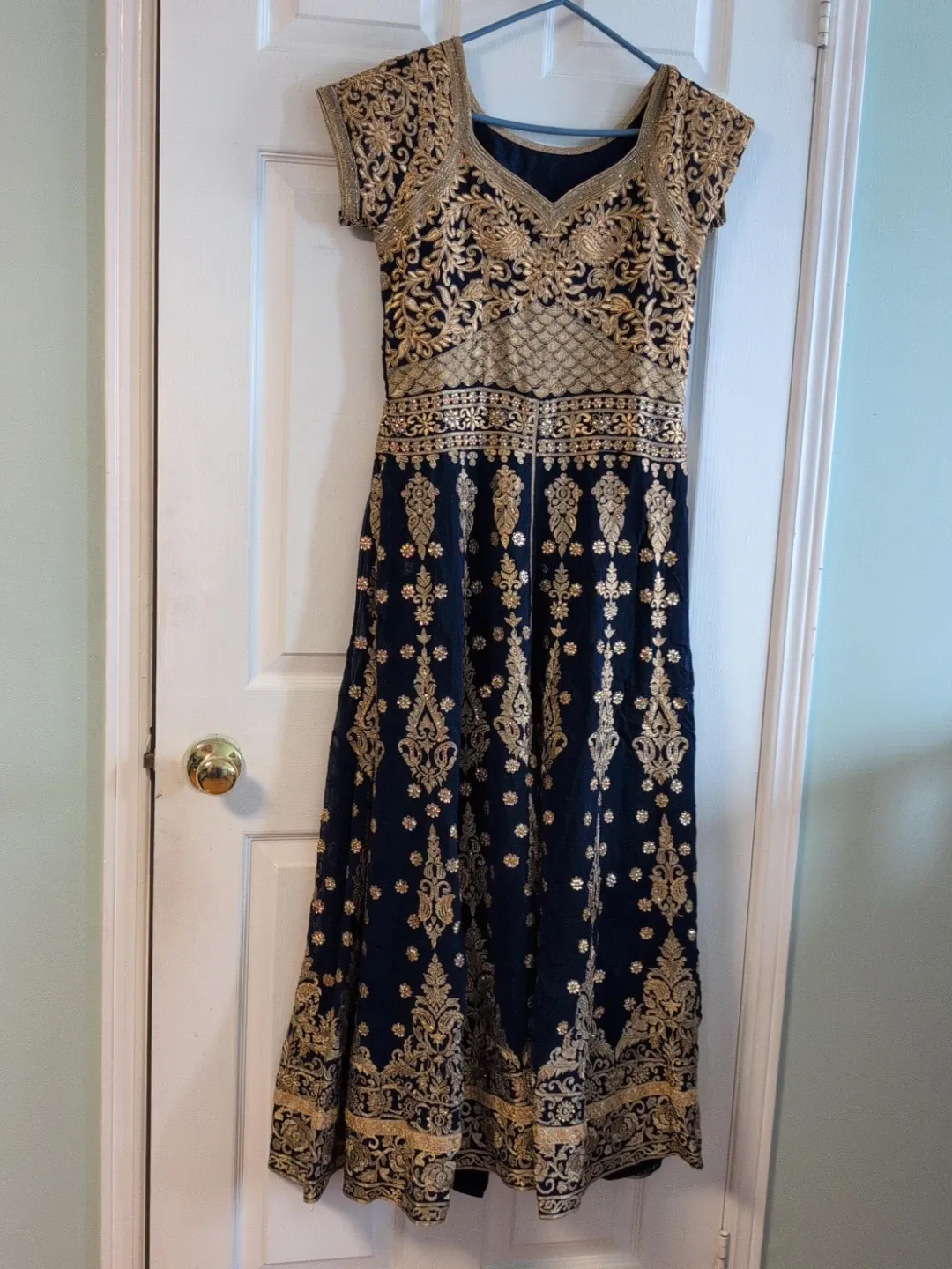 Beautiful navy blue Anarkali dress with intricate gold embroidery. Short sleeves and a V-neck design. Perfect for special occasions!