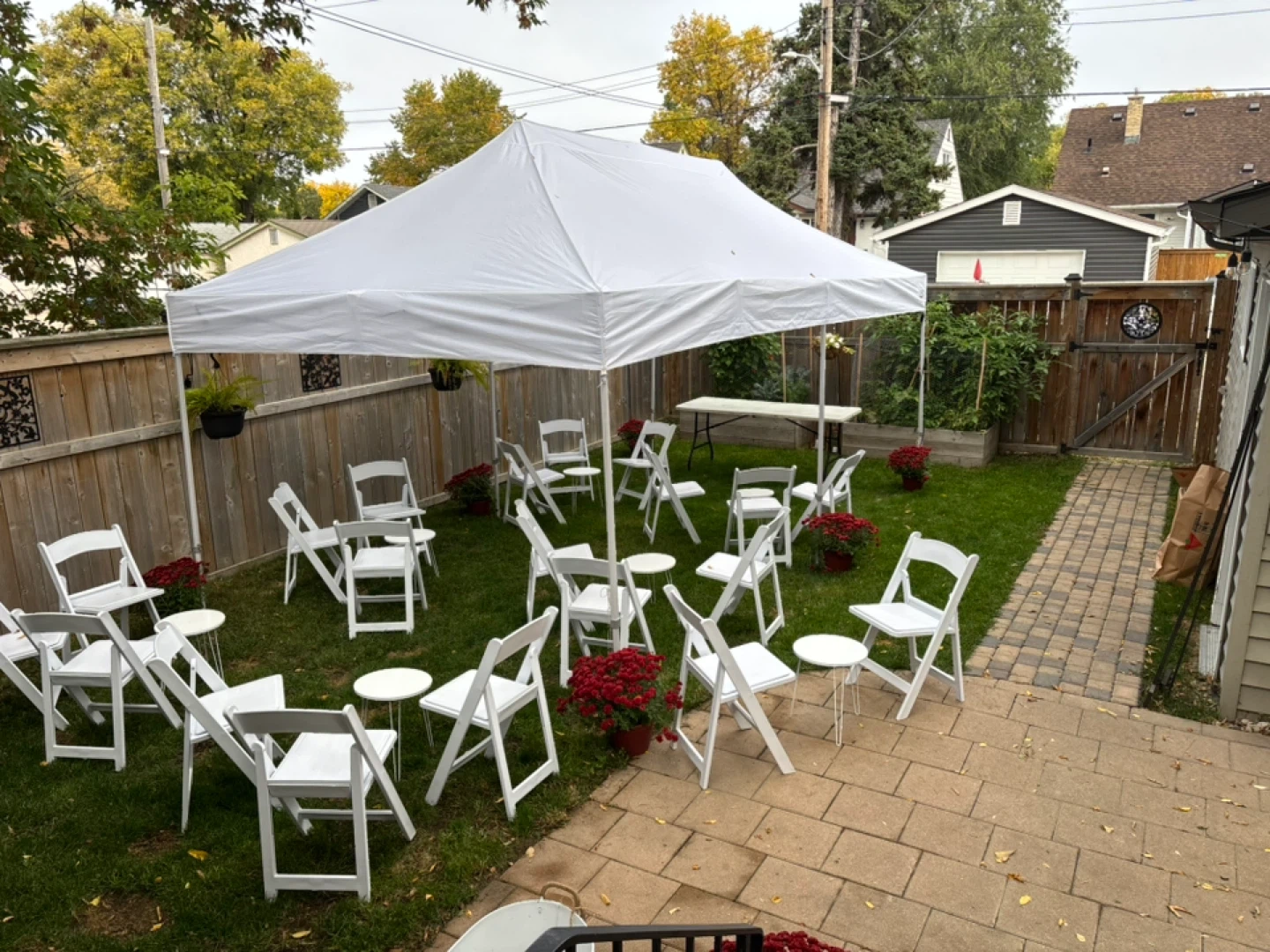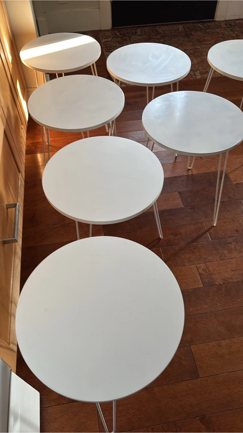 Selling cute little white round side tables! They have a clean, minimalist look with a white top and hairpin legs. Perfect for small spaces or as an accent piece in any space.