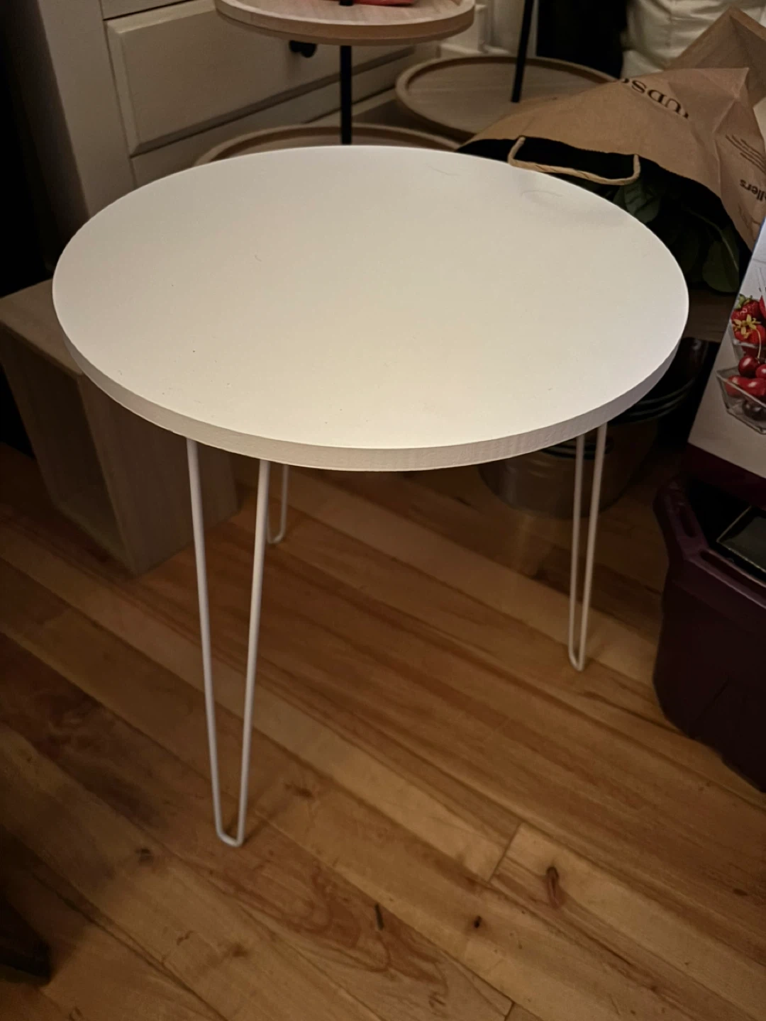 Selling cute little white round side tables! They have a clean, minimalist look with a white top and hairpin legs. Perfect for small spaces or as an accent piece in any space.