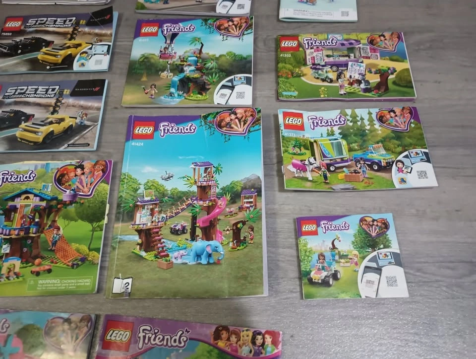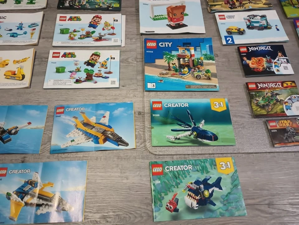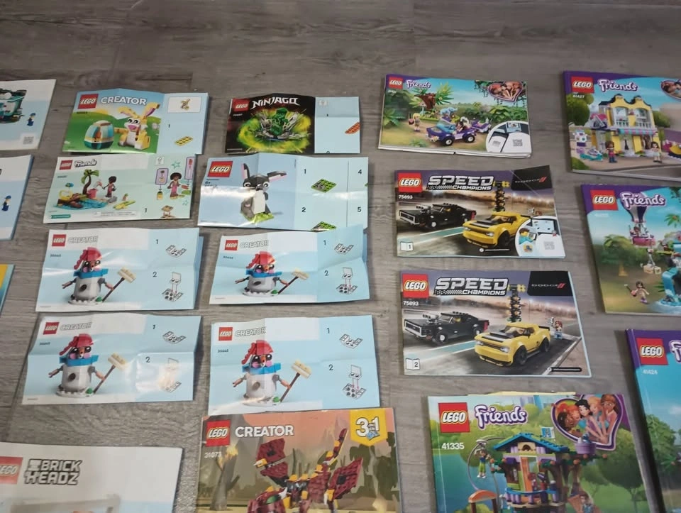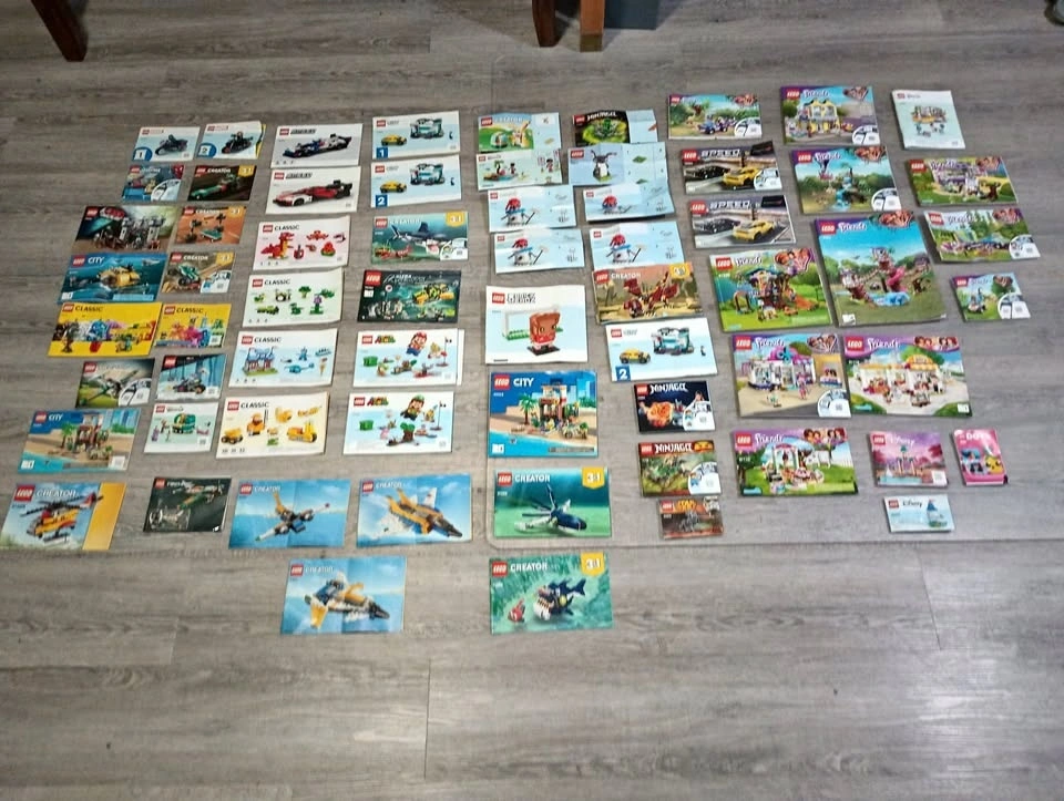 Large lot of 65 Lego building instruction manuals from various sets like Creator, Classic, Speed Champions, Super Mario, Friends, City and others. From a SF/BF home in Charleswood.