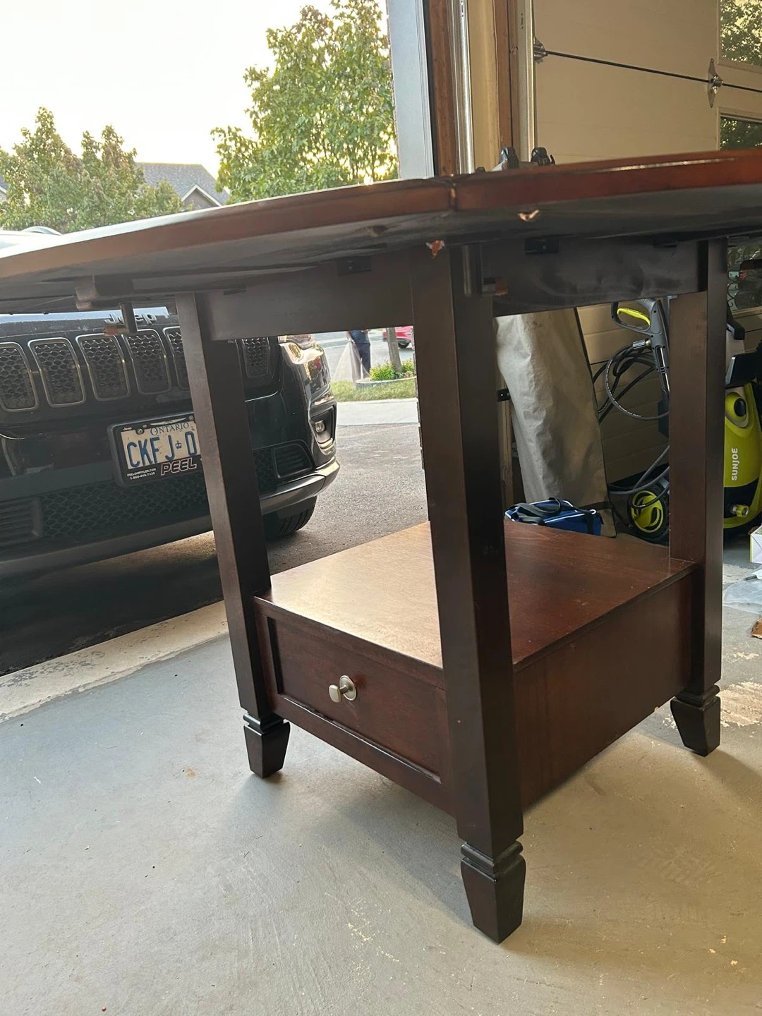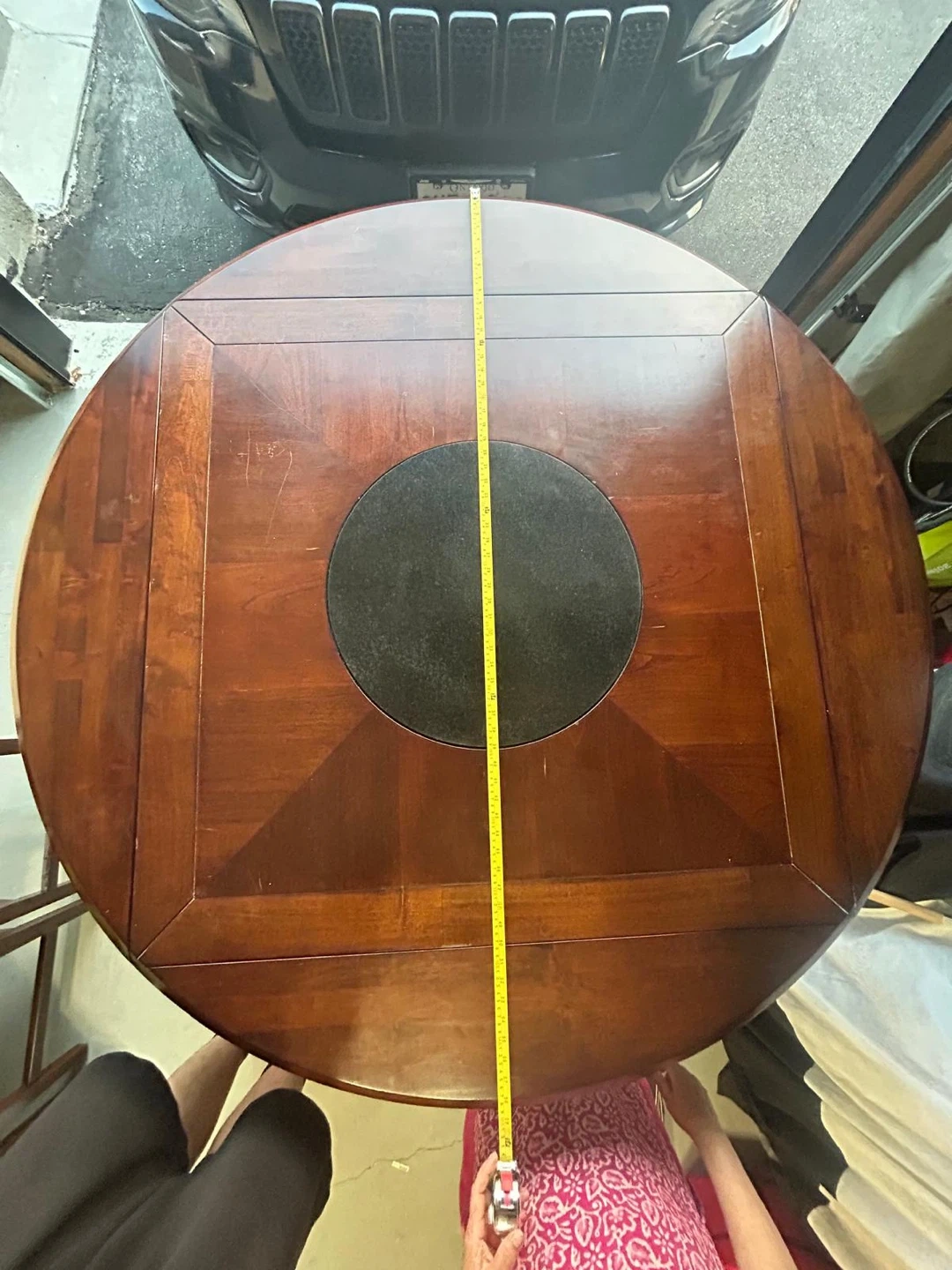 This dark wood dining table features a convenient drawer for storage. It has a central insert for added detail. The table measures 40 inches square.